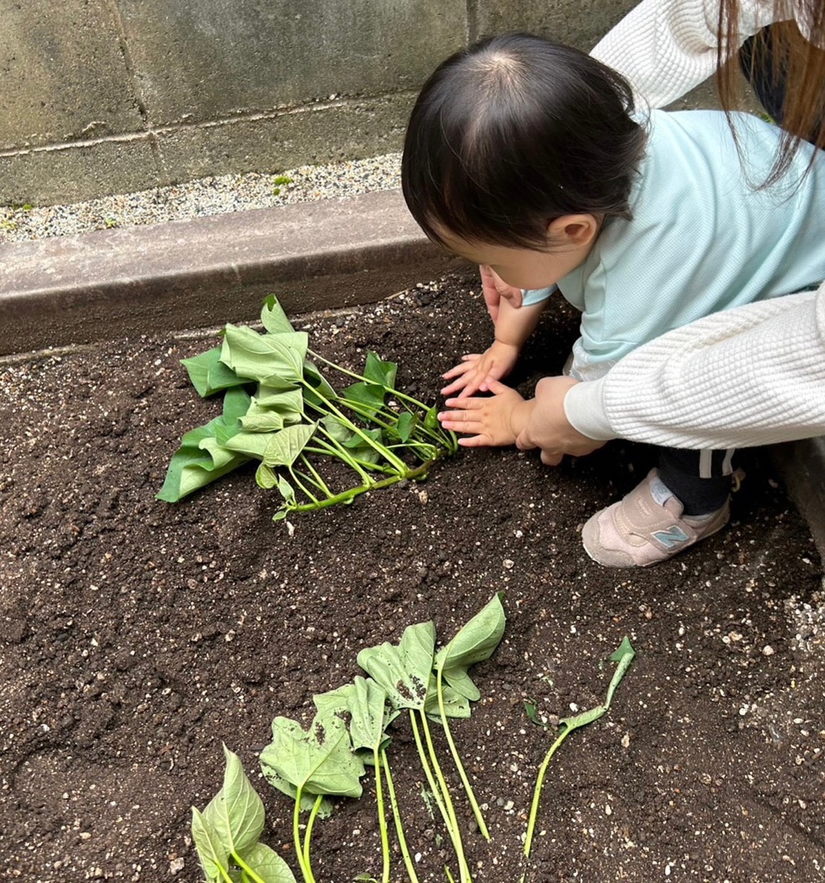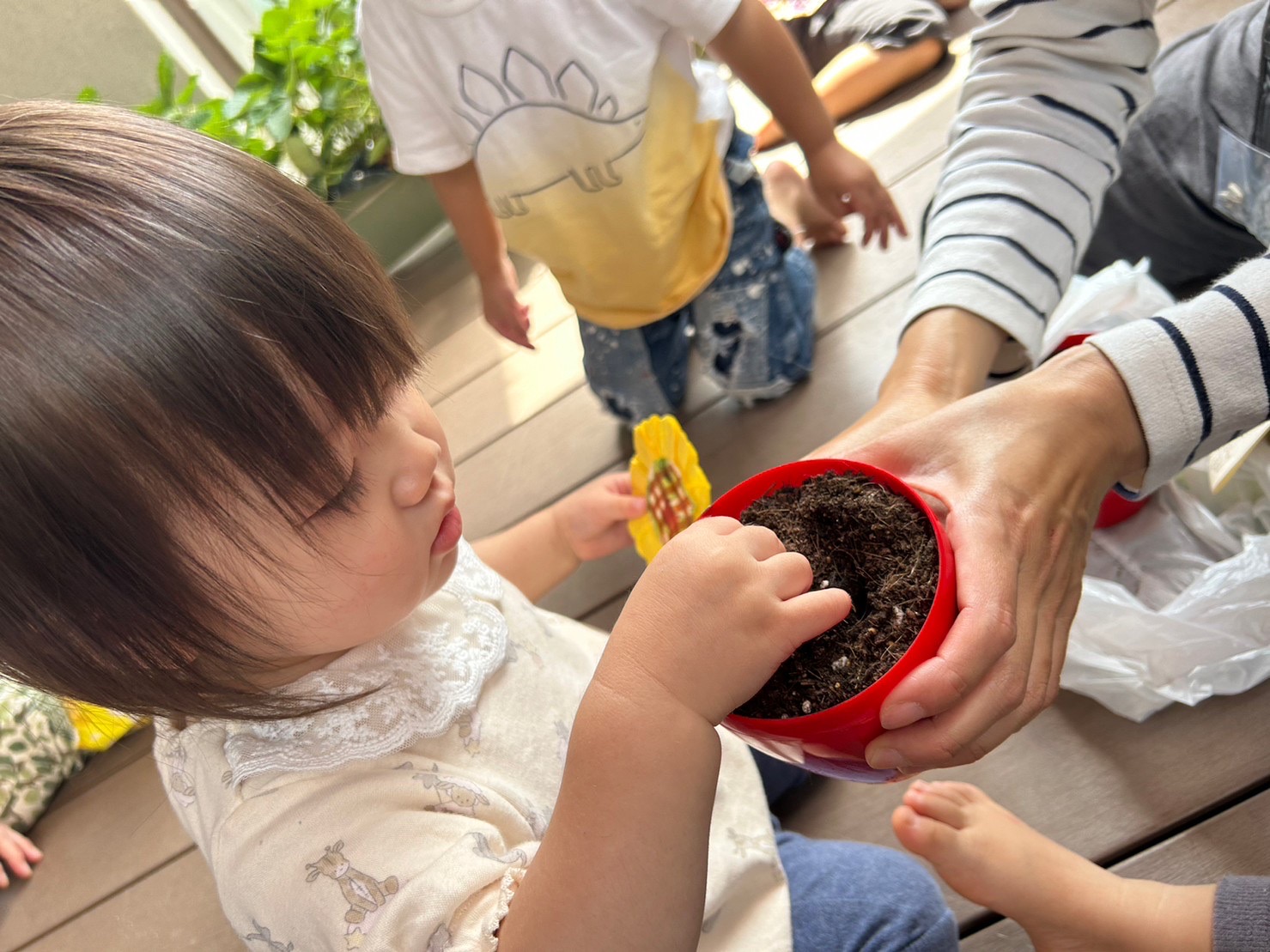 「お花の赤ちゃんだよ」と話をすると、子どもたちは、優しくトントンと土を触っていました。