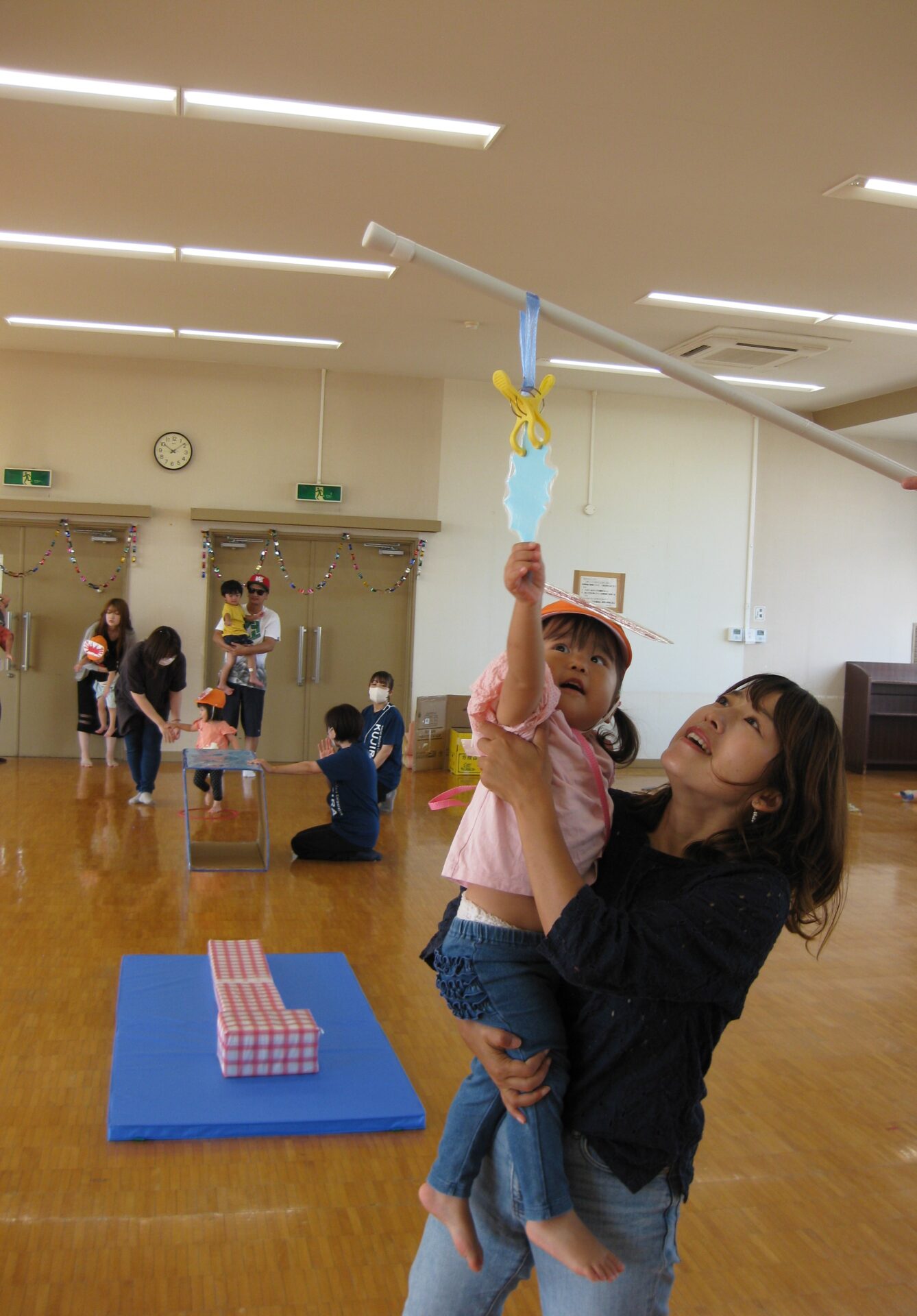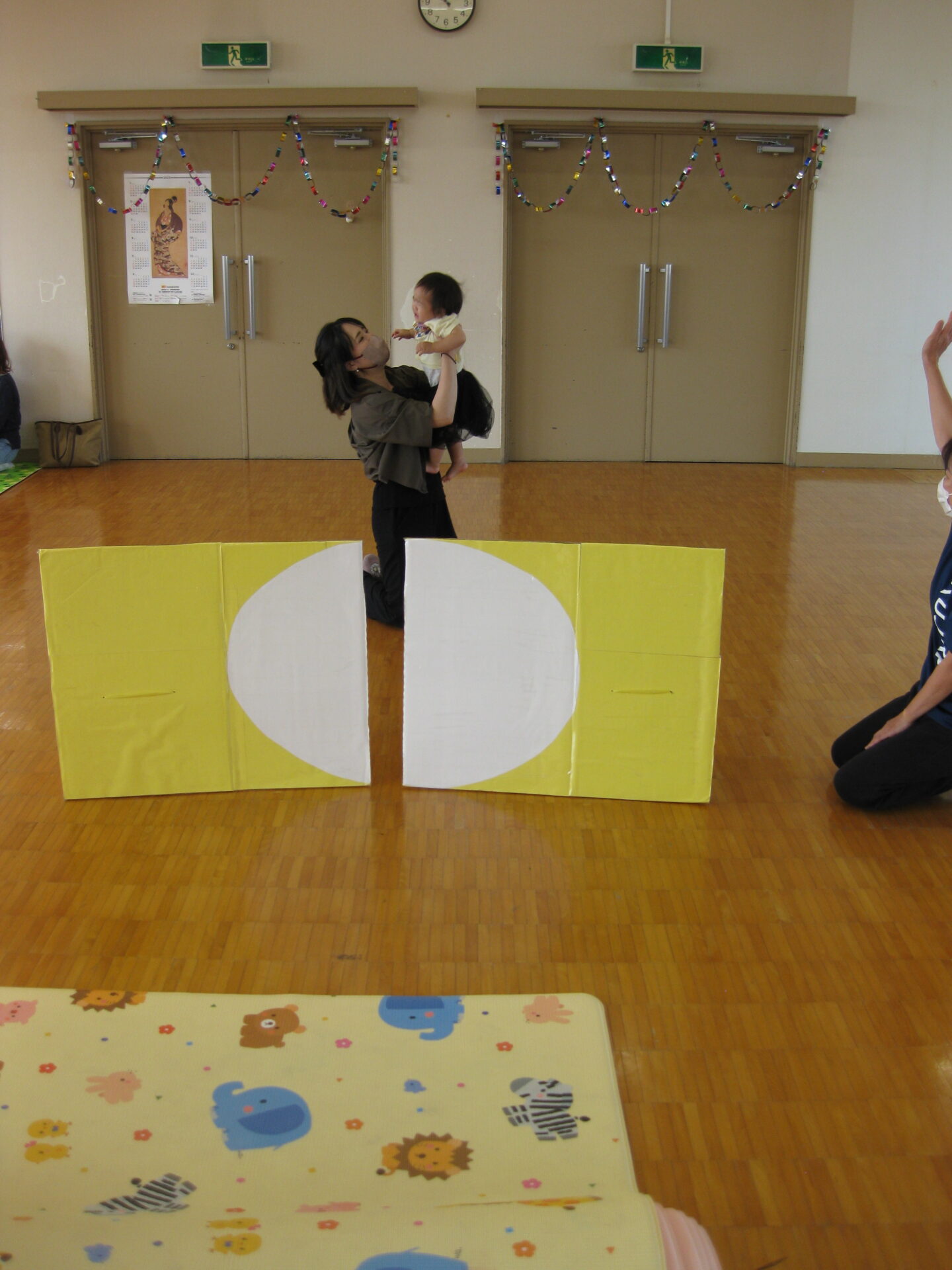 0歳児さんは親子ふれあいリズム お名前を呼ばれて可愛くたまごから飛び出てきます。