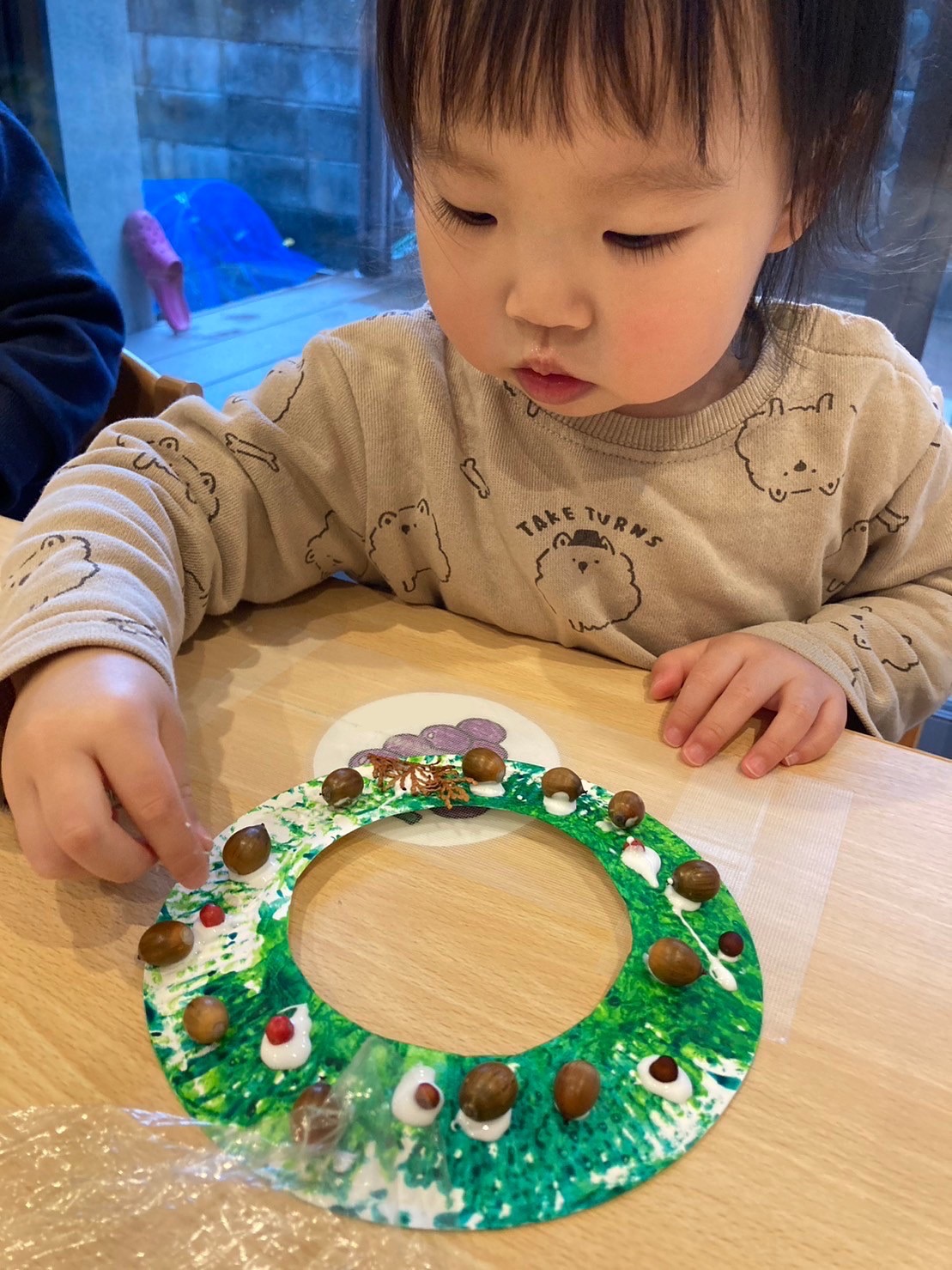 タンポでポンポン!と色をつけた土台にお散歩で拾ってきたどんぐりやだいすきな”赤い実”こと南天を思い思いにくっつけました😊