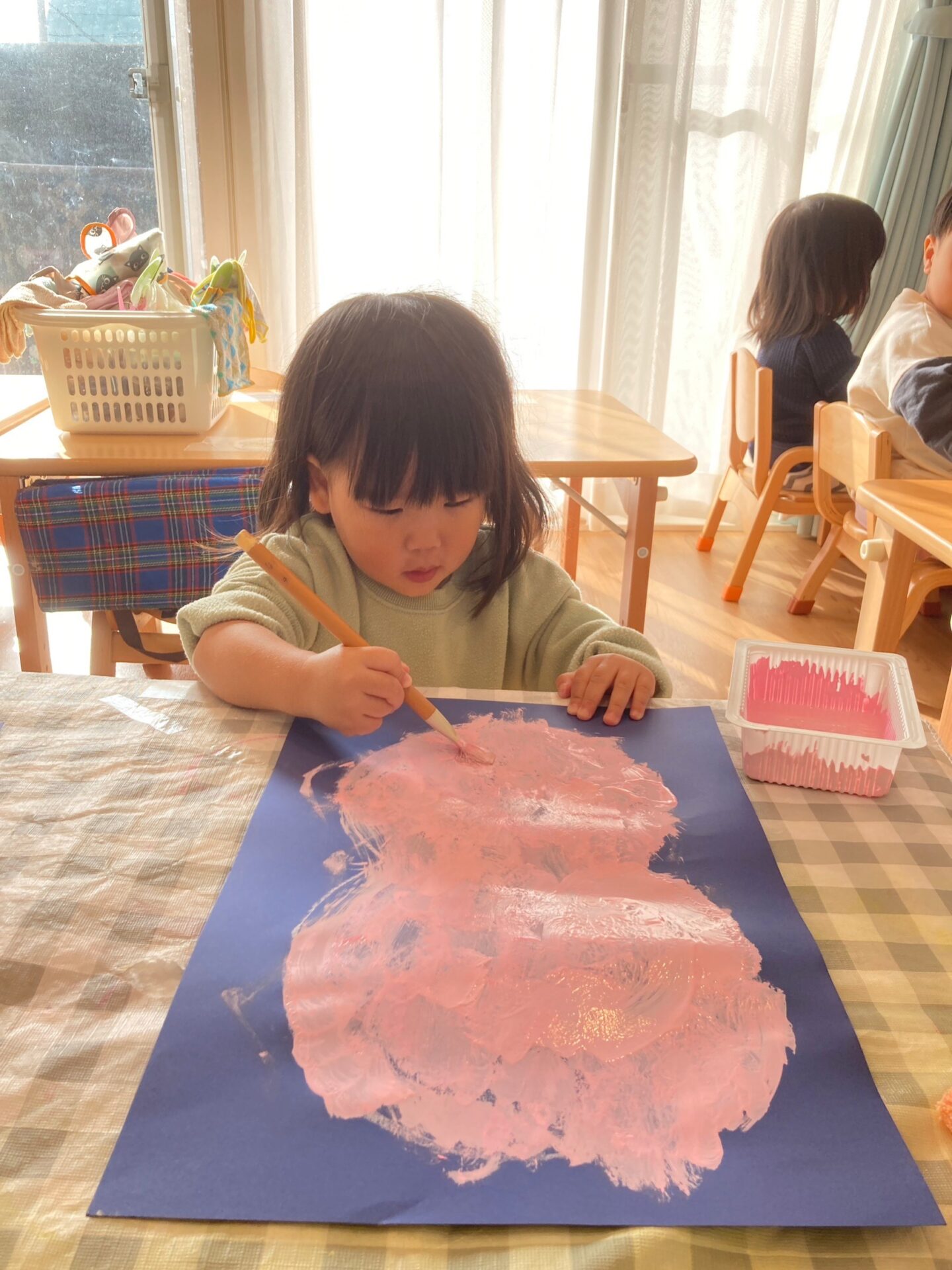 大きな紙に好きな色を選んでぬりぬり、じっくりとたっぷり塗りました♪