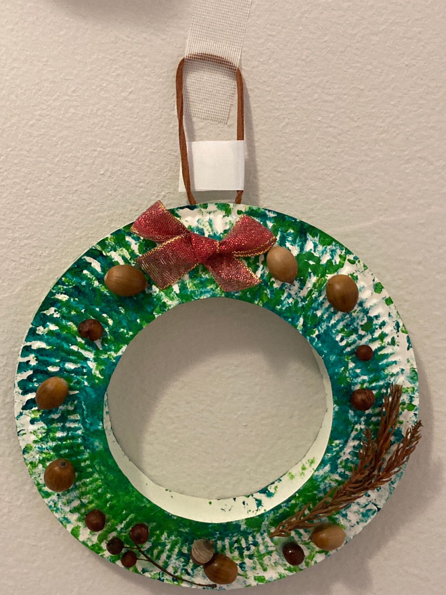 シールのようにすぐにくっつかない接着剤に苦戦しながらもたくさん飾り素敵なリースができました🌟