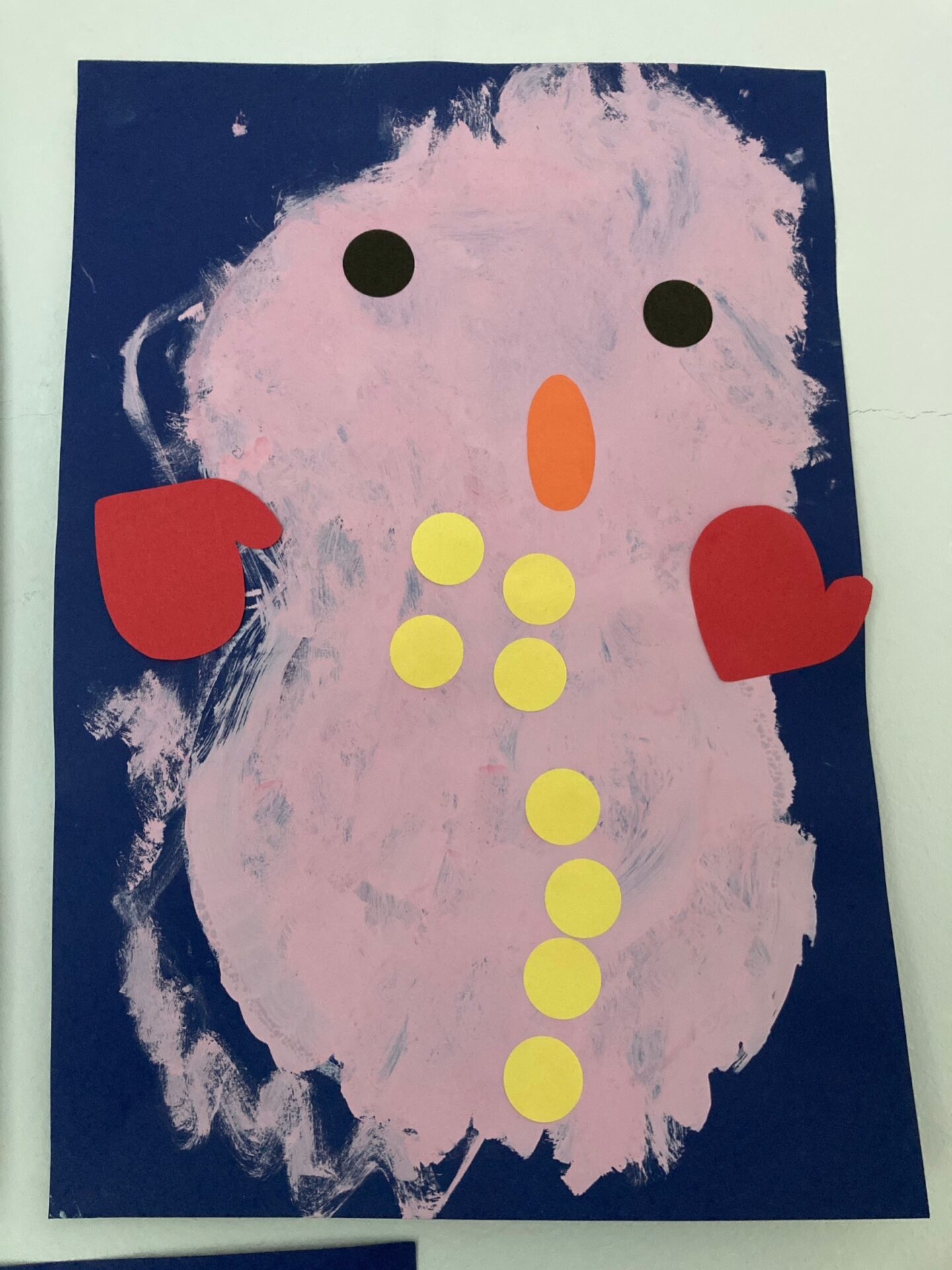 そして目、にんじんの鼻🥕、手袋、ボタンを糊で丁寧に貼っていきます。