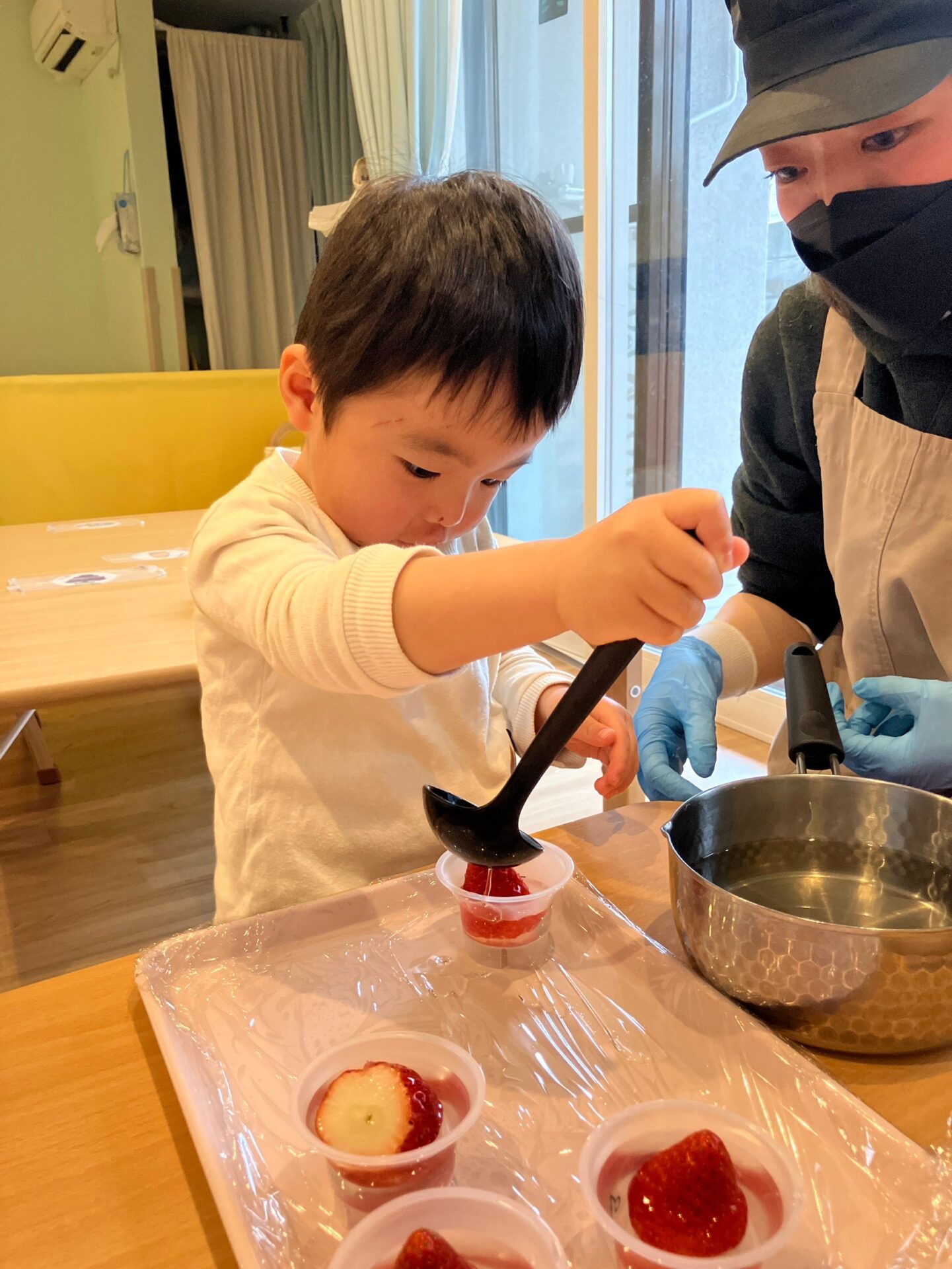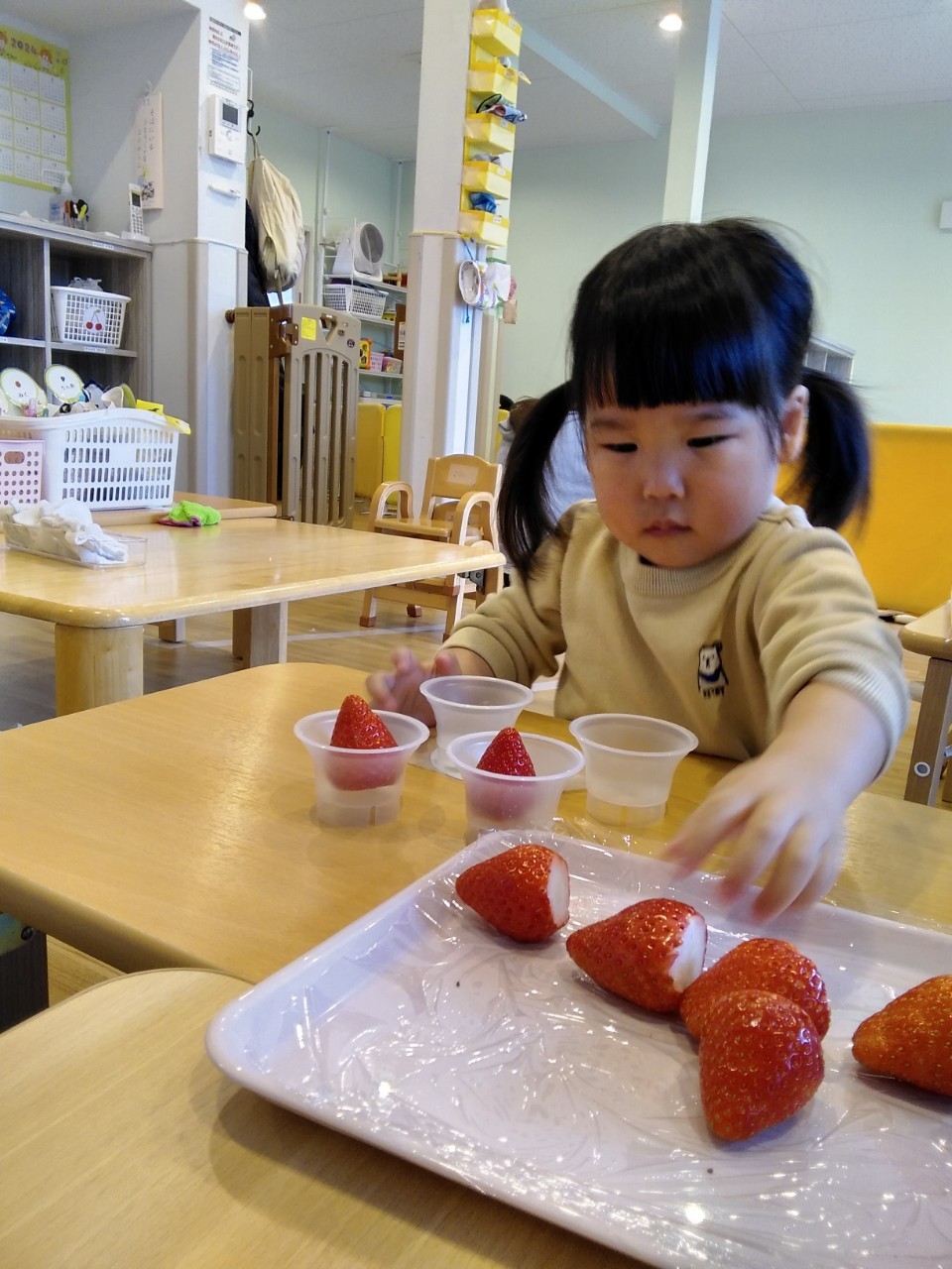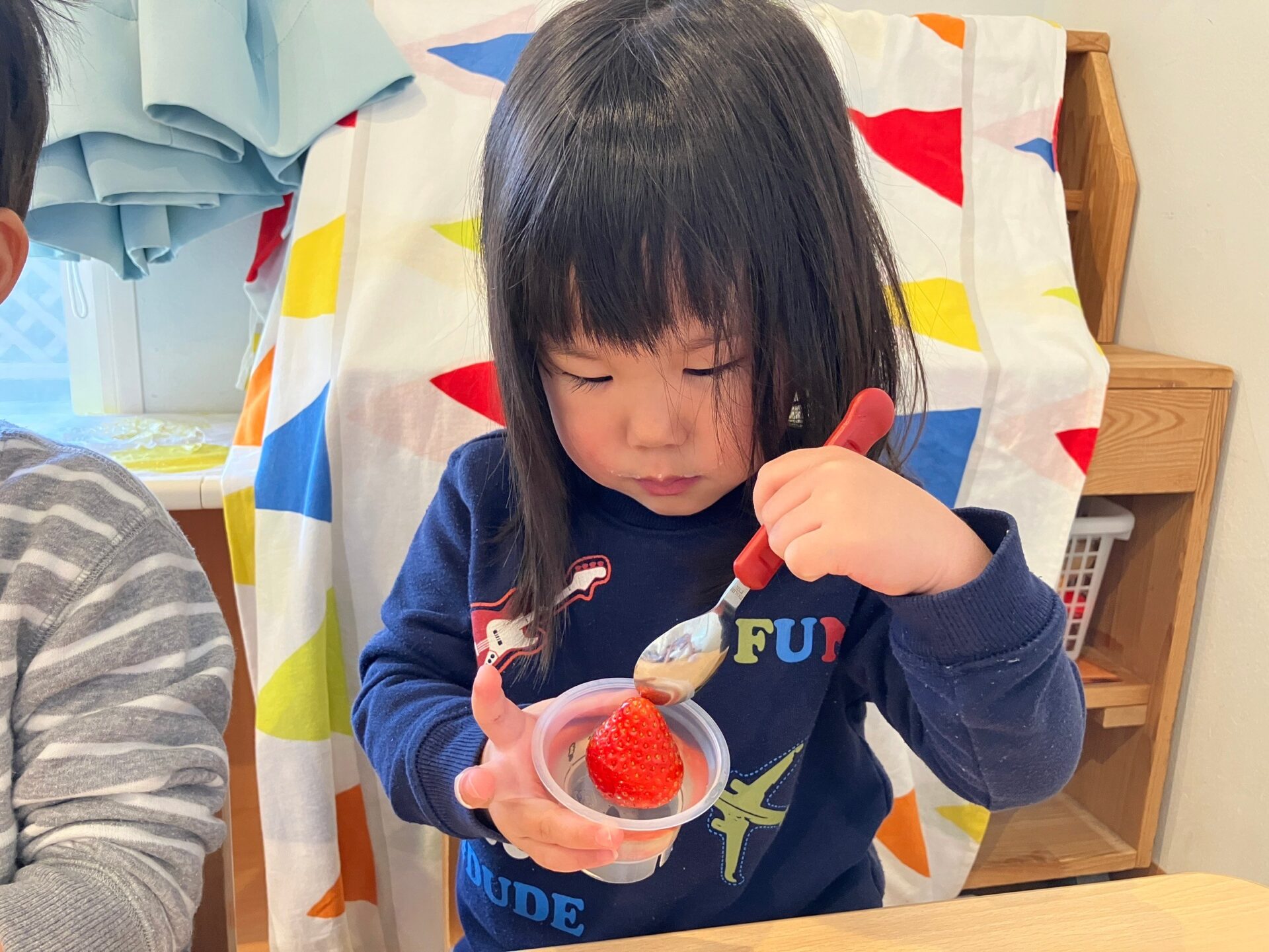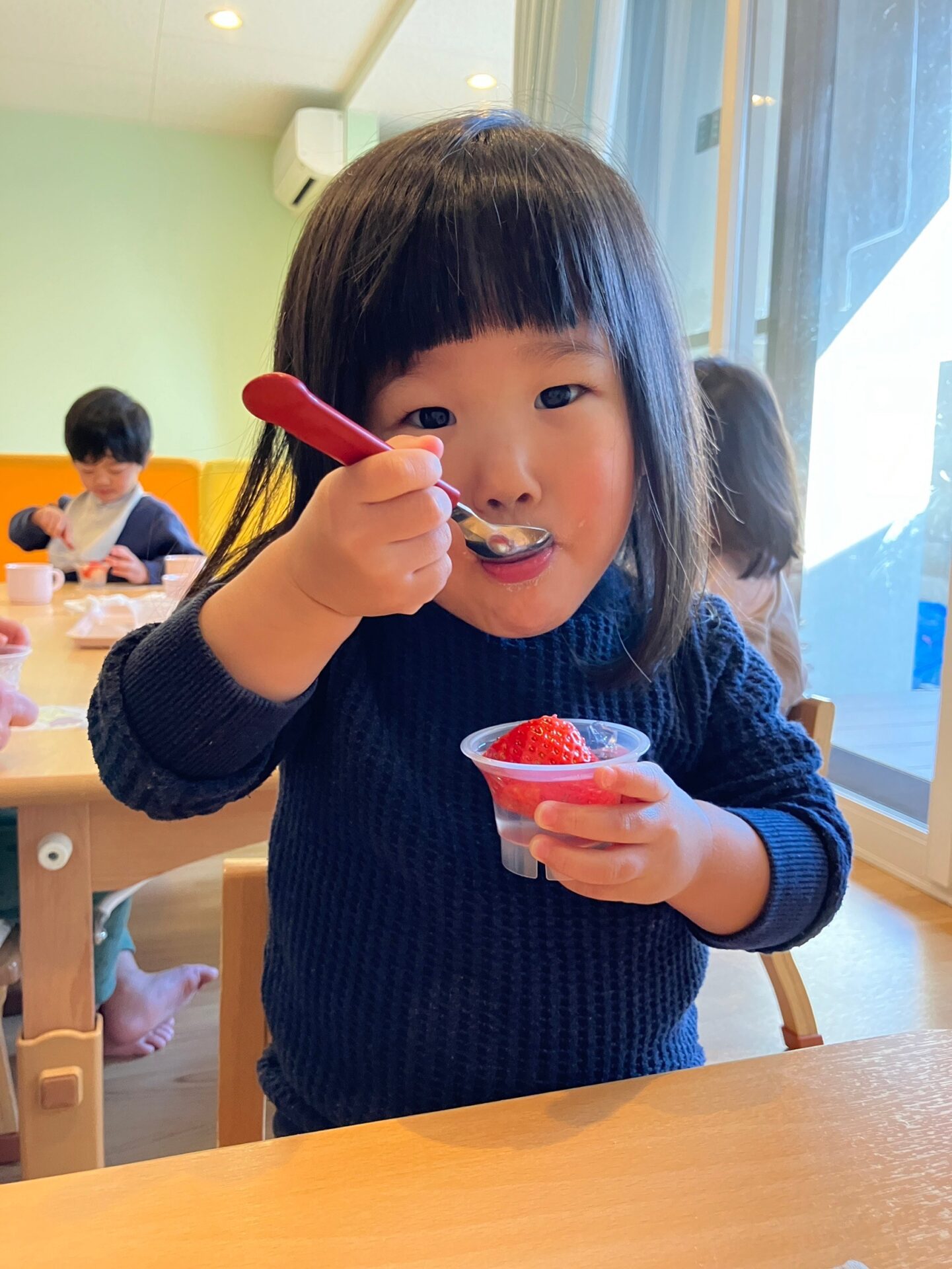 お昼寝から起きると「ぷるんぷるんできた??」「いちご!!」と待ちきれない様子