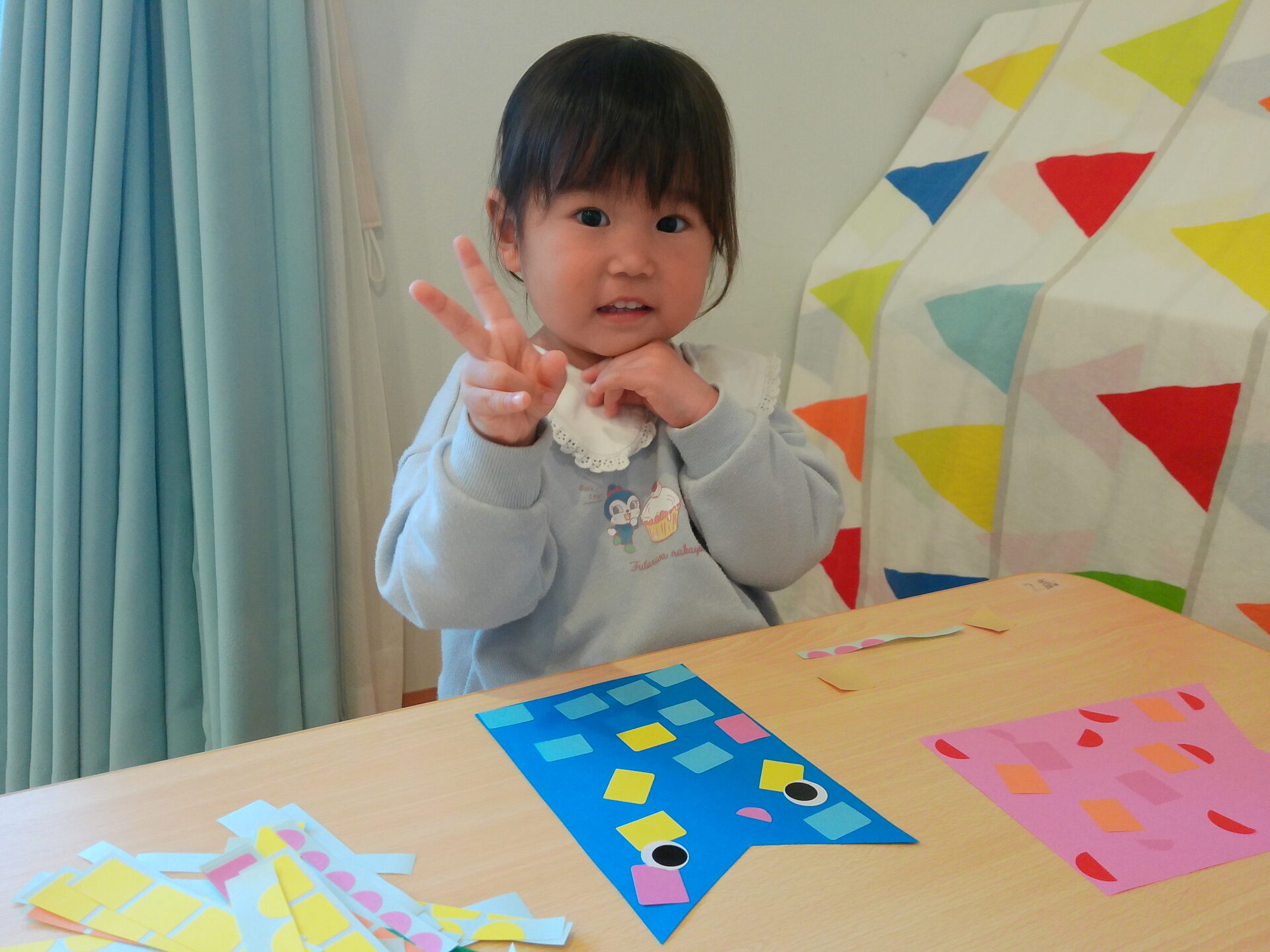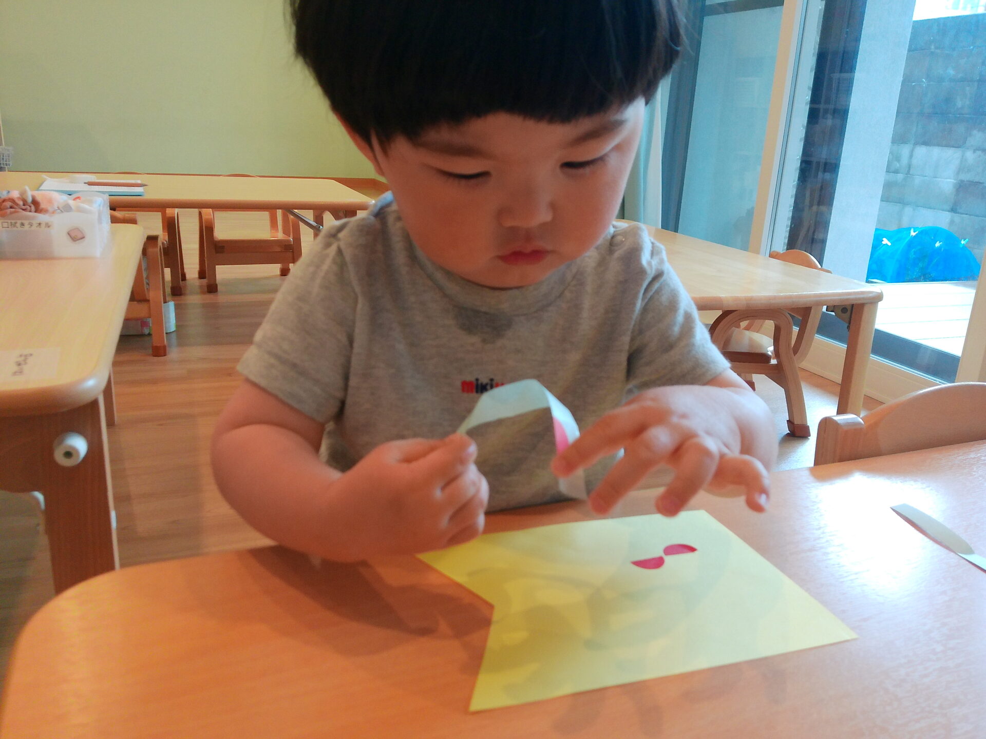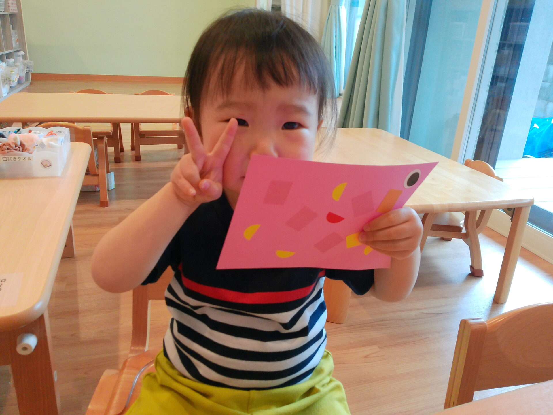 2歳児さんはシールを使ってこいのぼりを作りました♪