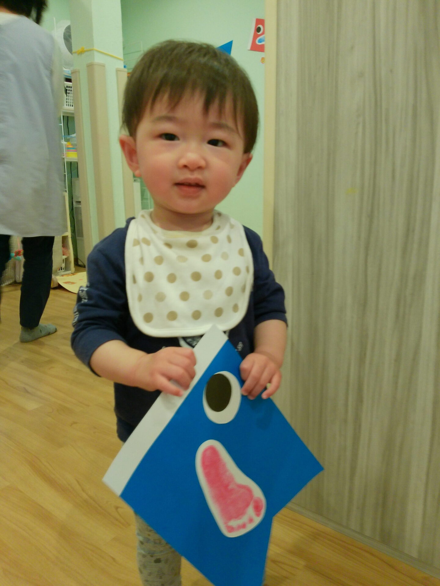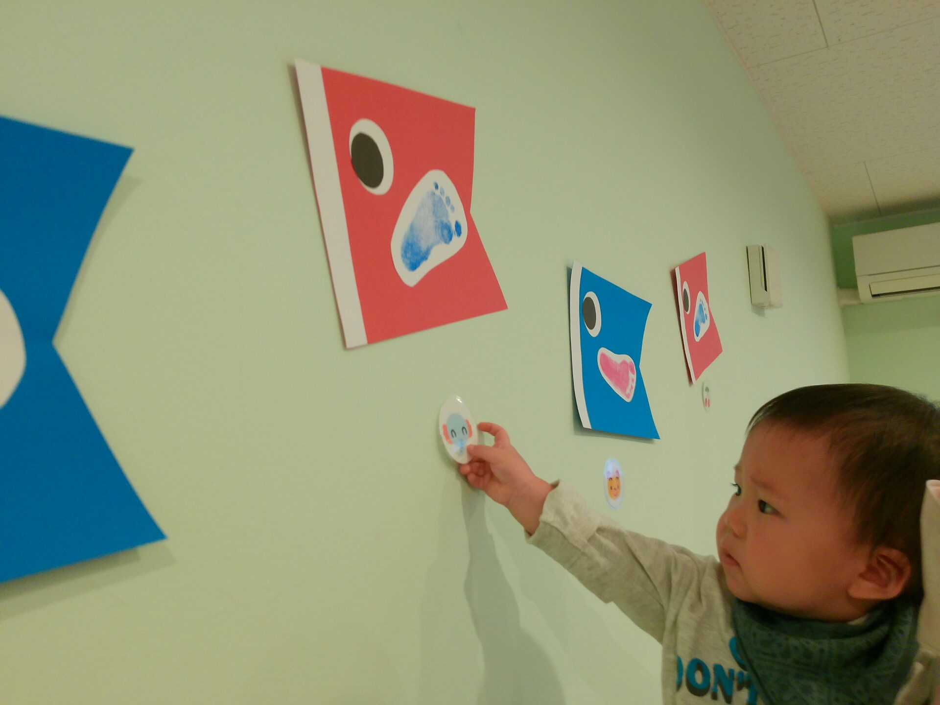 みんなのかわいい足形を風に吹かれて泳ぐこいのぼりに貼り・・・