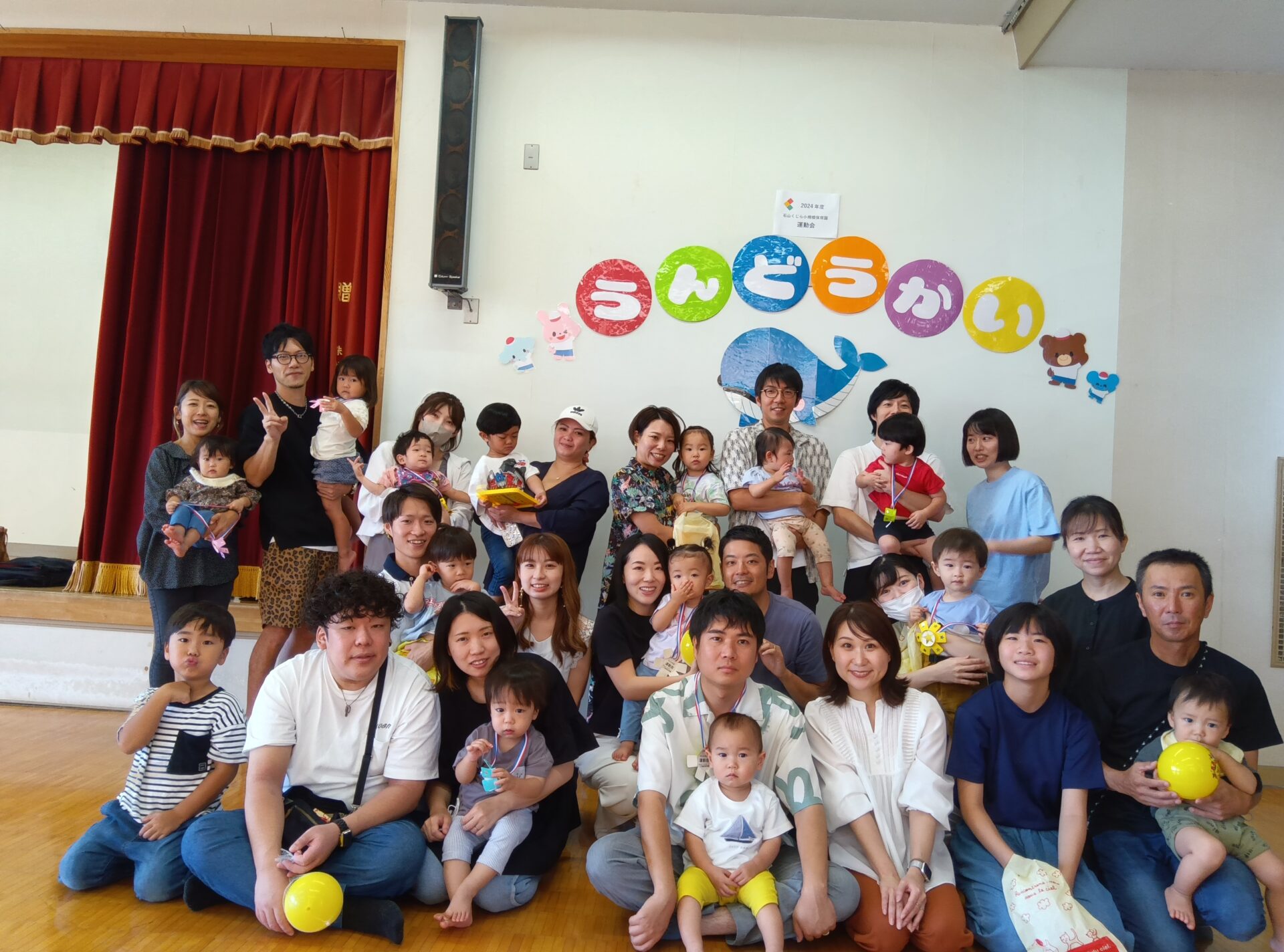 晴嵐コミュニティセンターの大ホールをお借りし、お家の方と一緒にたくさん身体を動かしました。