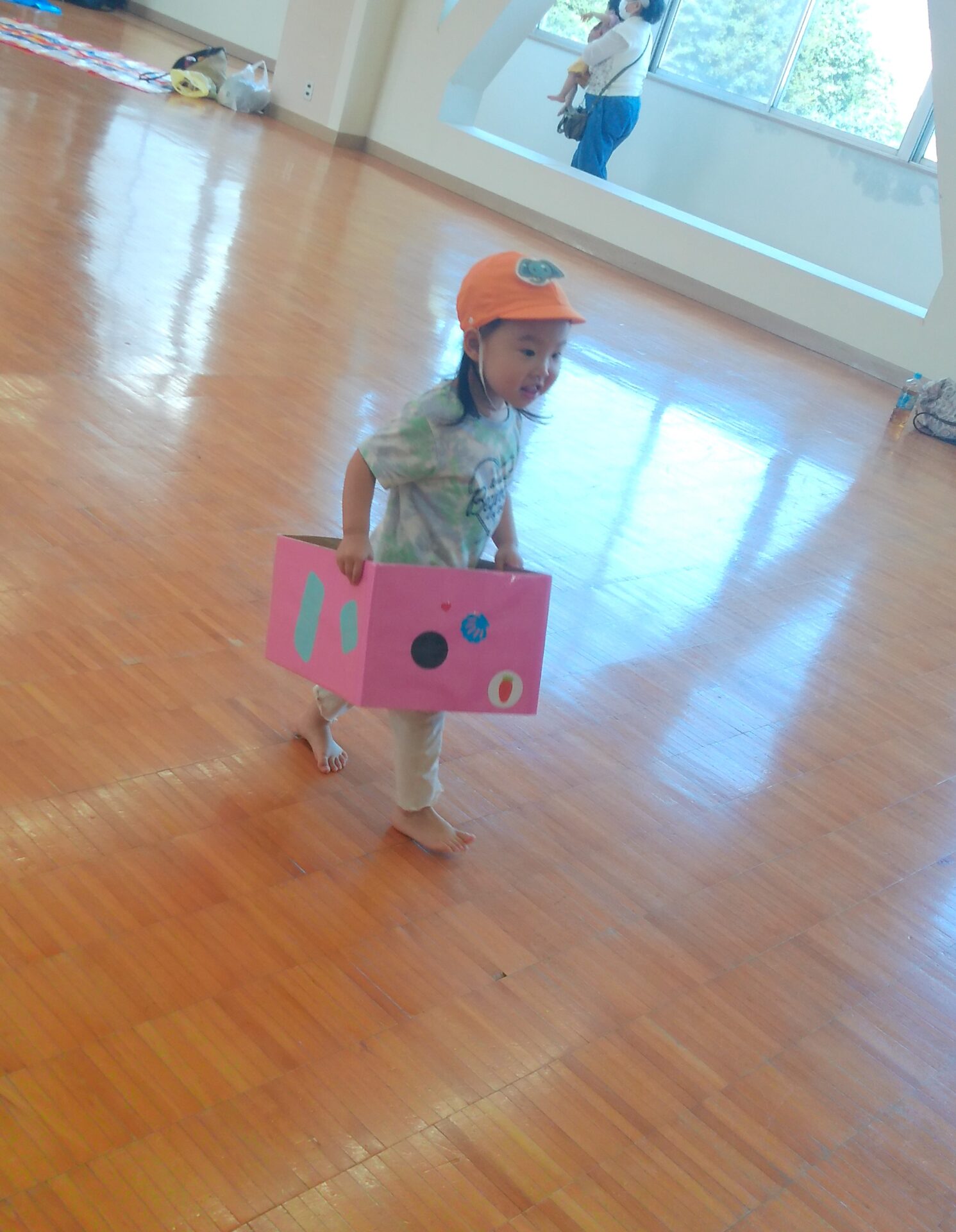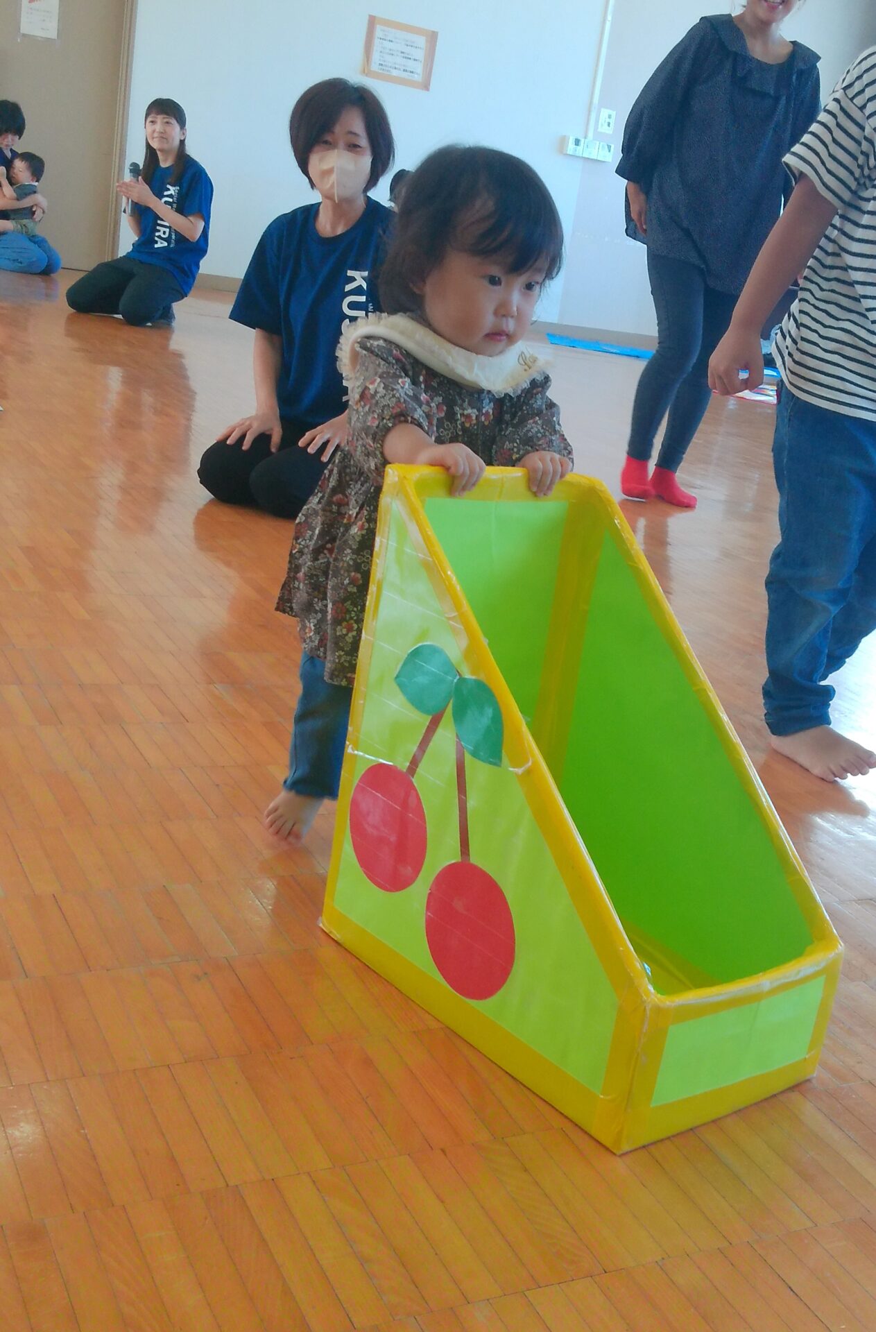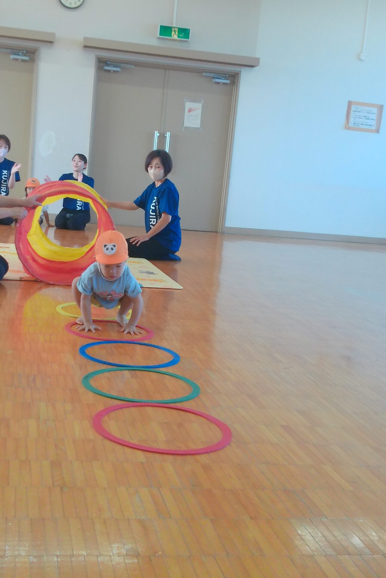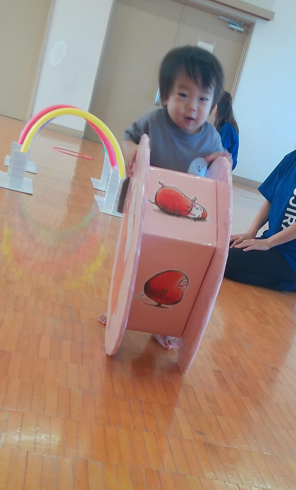0歳児さん、1歳児さんはトンネルをくぐって箱車を押してたり、コロコロだるまさんを転がします。