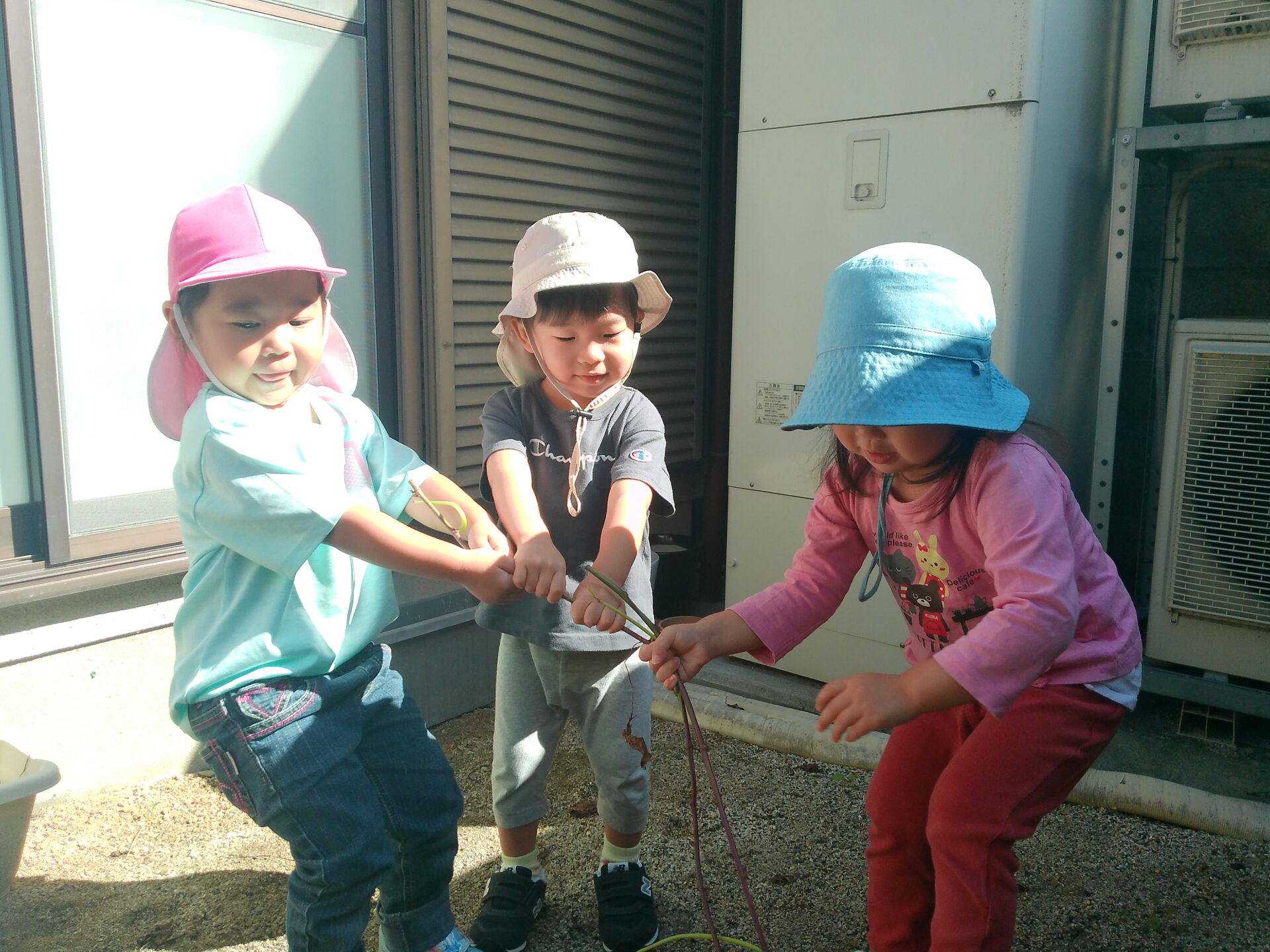 しりもちをついても、「おいもがみえないー」と言いながらみんなで一緒に引っ張りました。