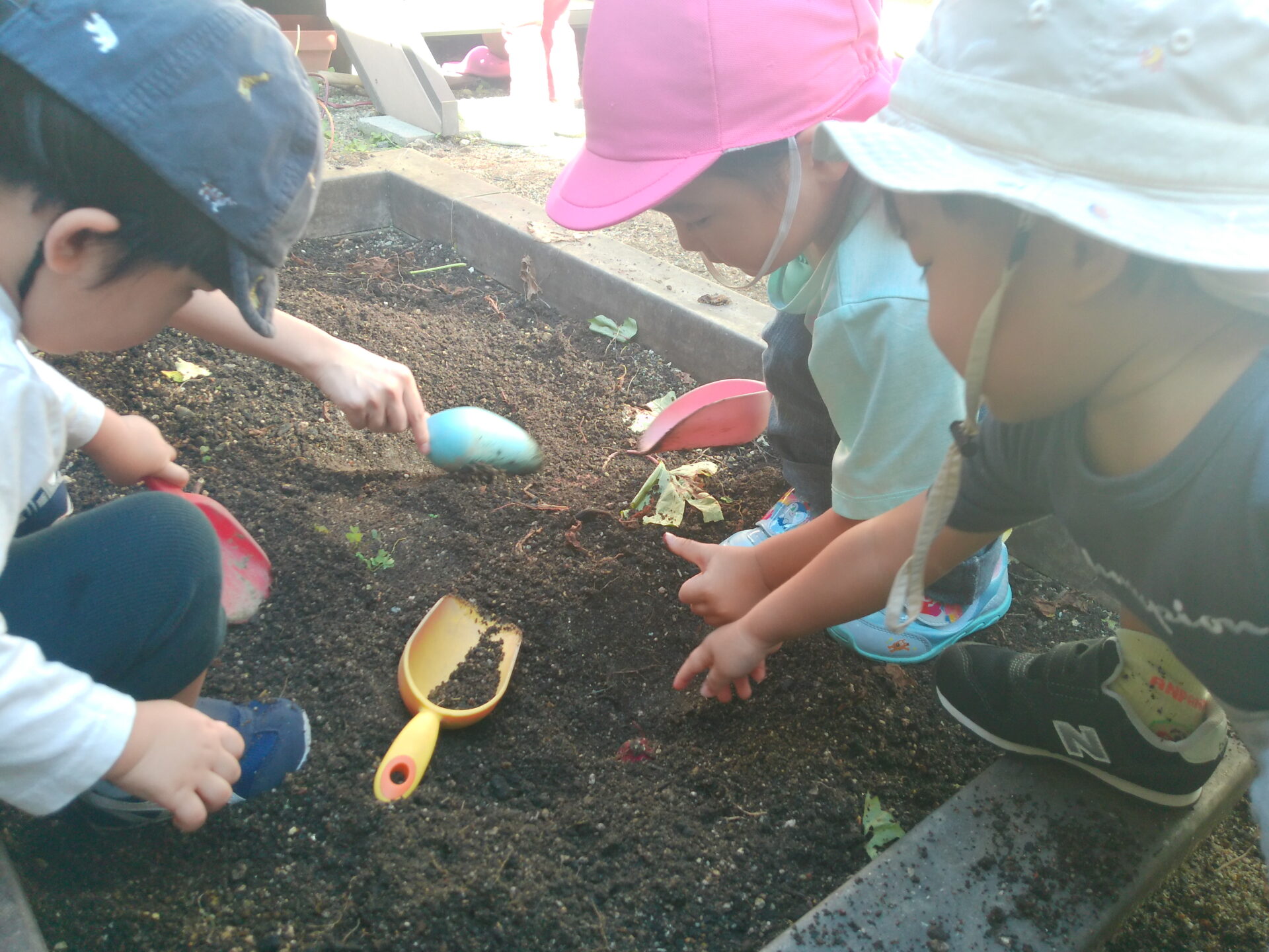自園栽培だからこそ、ゆっくりと畑作りから収穫までを通して、食への関心と期待や自分で収穫したという経験が出来る、小さいけれど石山くじら小規模保育園自慢の菜園です。