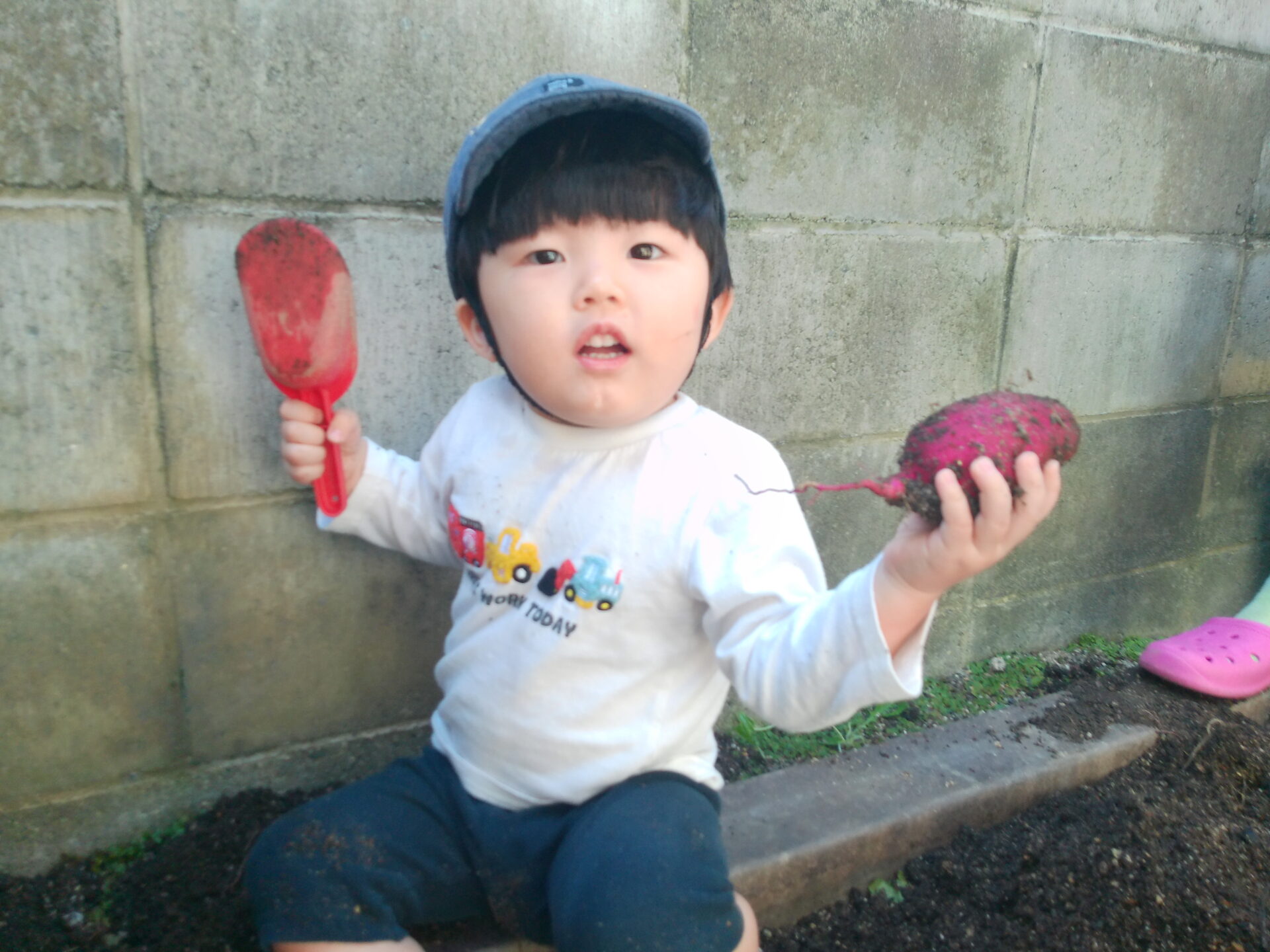 いもが見えてくると「むらさきがみえた!これ、おいもかな?」なんて声も上がり、スコップや手で土に触れ、いもを掘り出したその顔はニコニコ笑顔と充実感に満ちていました。