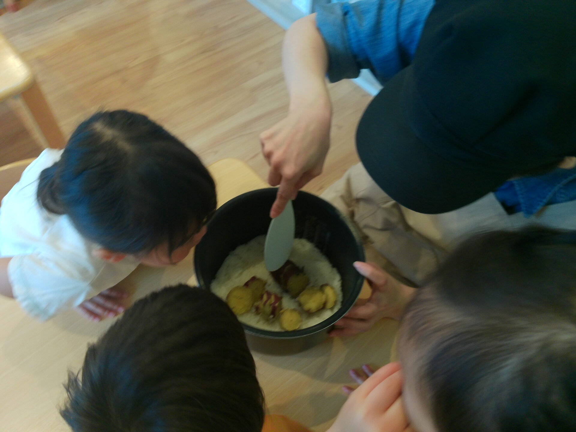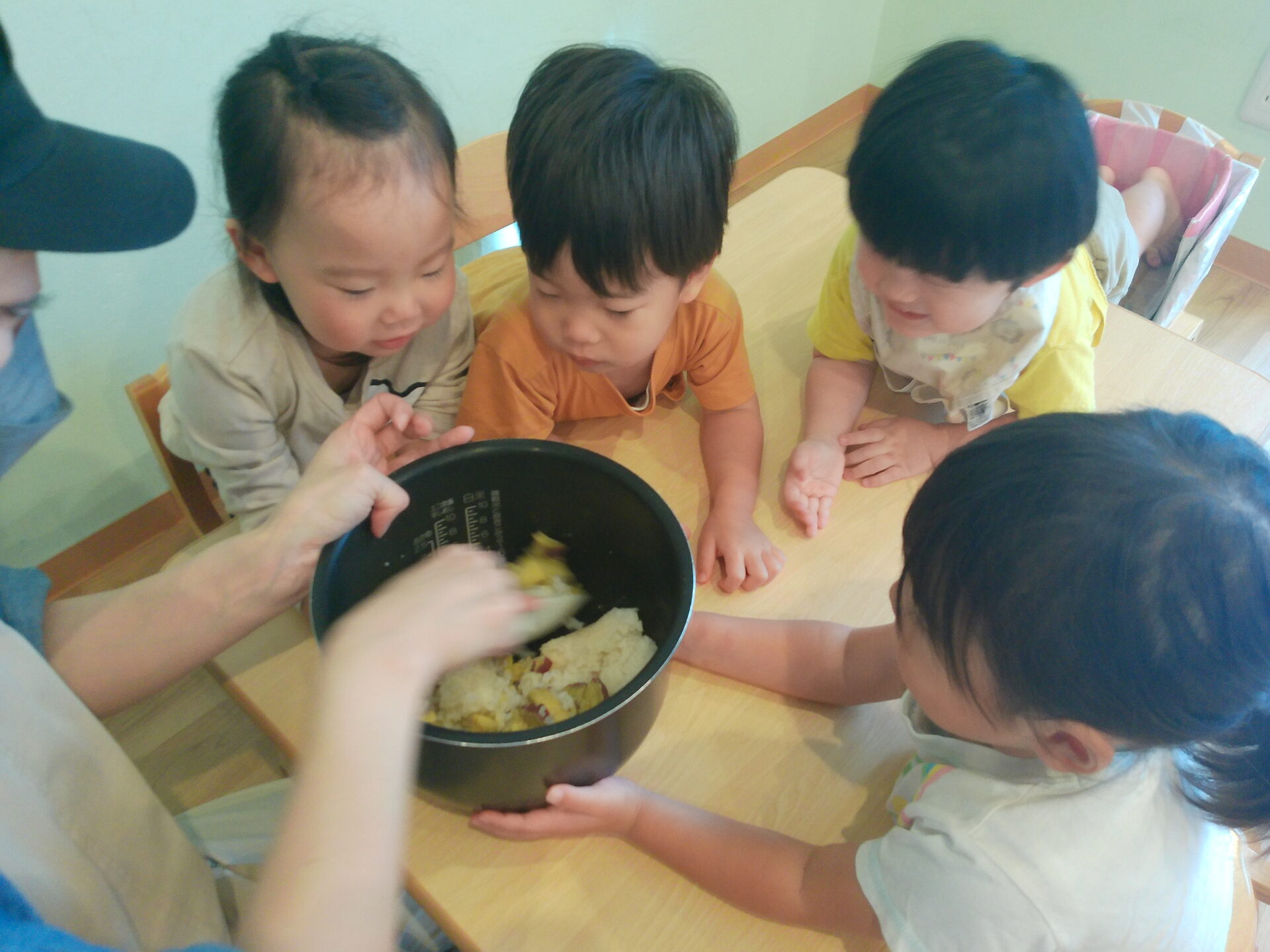 炊きあがったさつまいもごはんをお釜ごと保育室へ持っていき、目の前で混ぜると子どもたちは興味津々です!