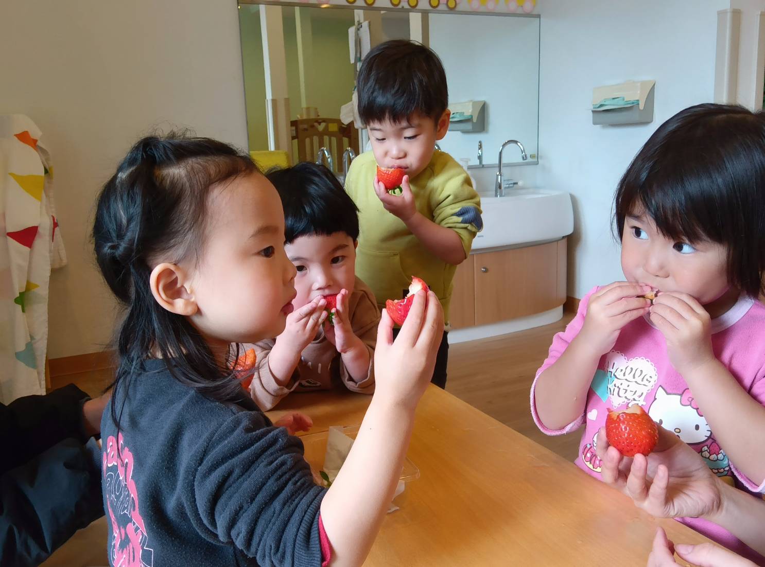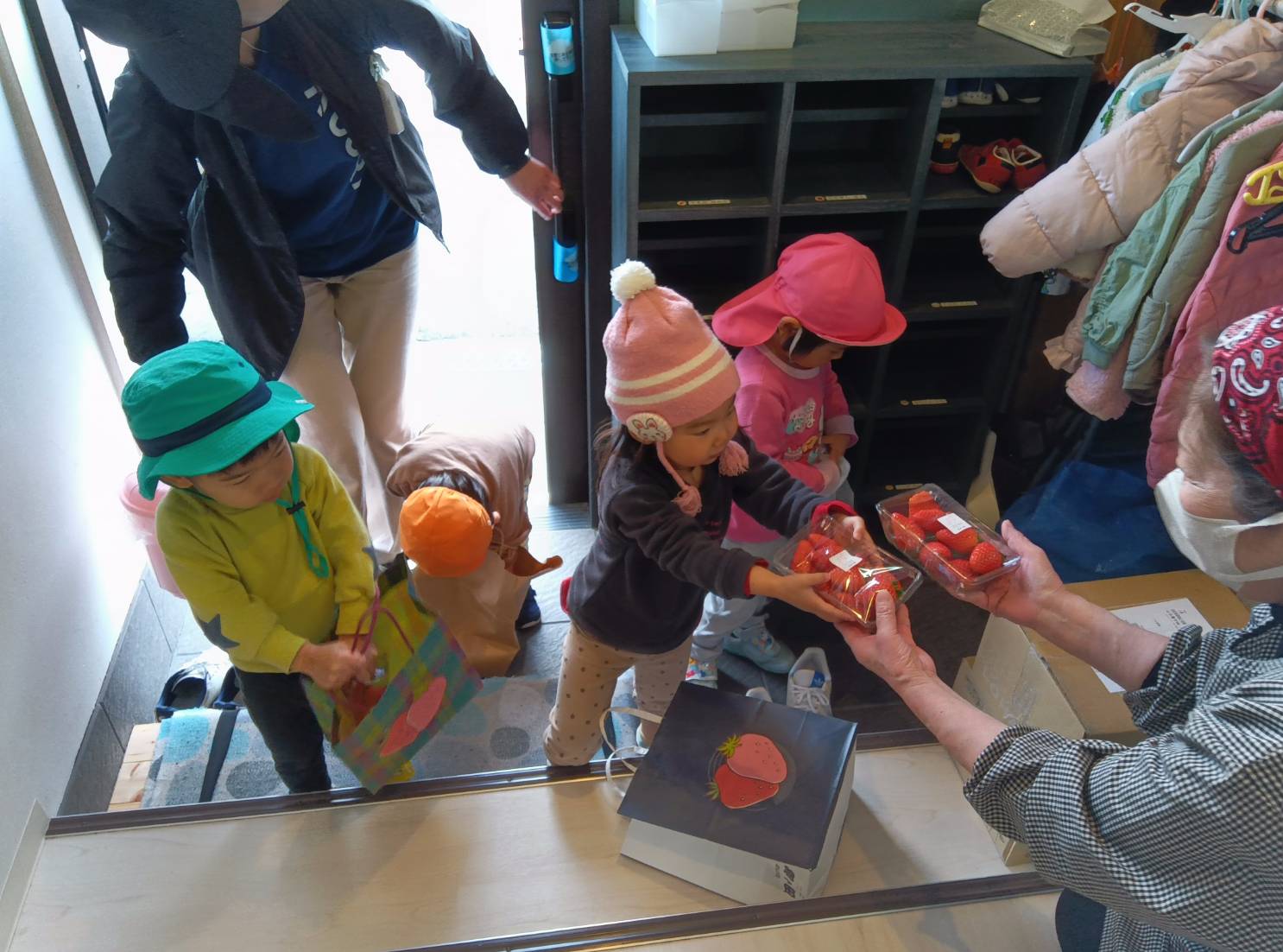 「おはようございますー!いちごくださーい!!」元気いっぱい挨拶。