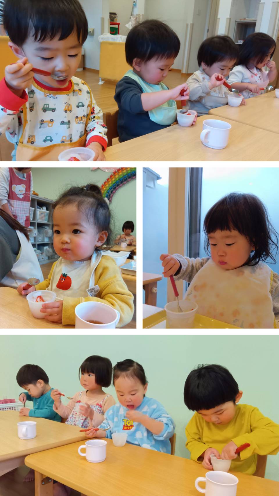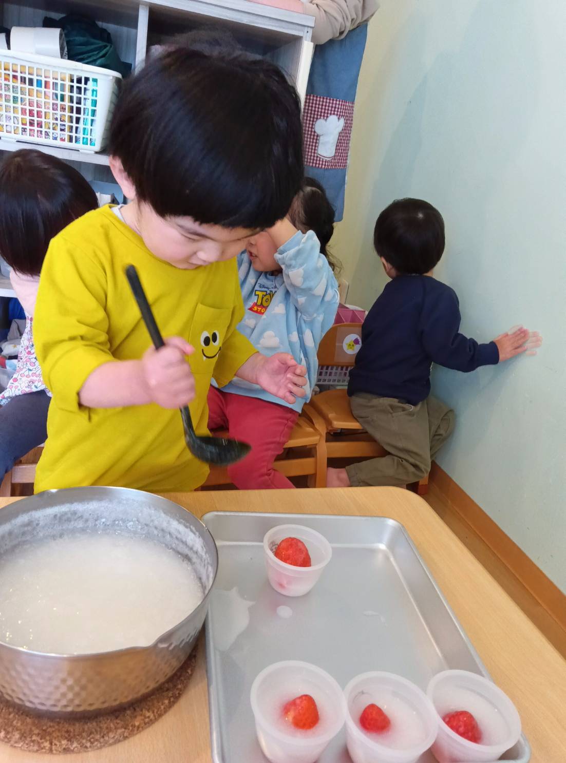 「おやつにたべる」「いちごゼリーつくる」と3時のおやつのカルピスゼリーを作ります♫