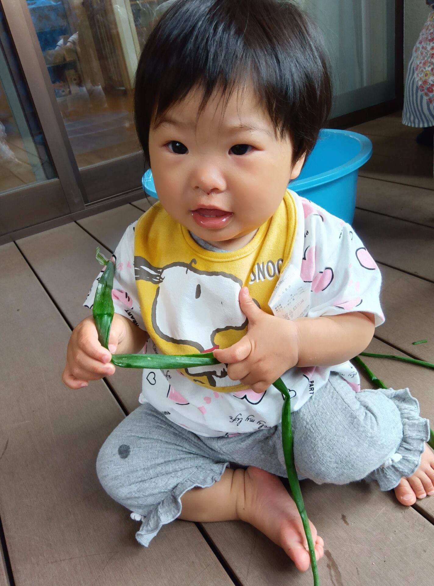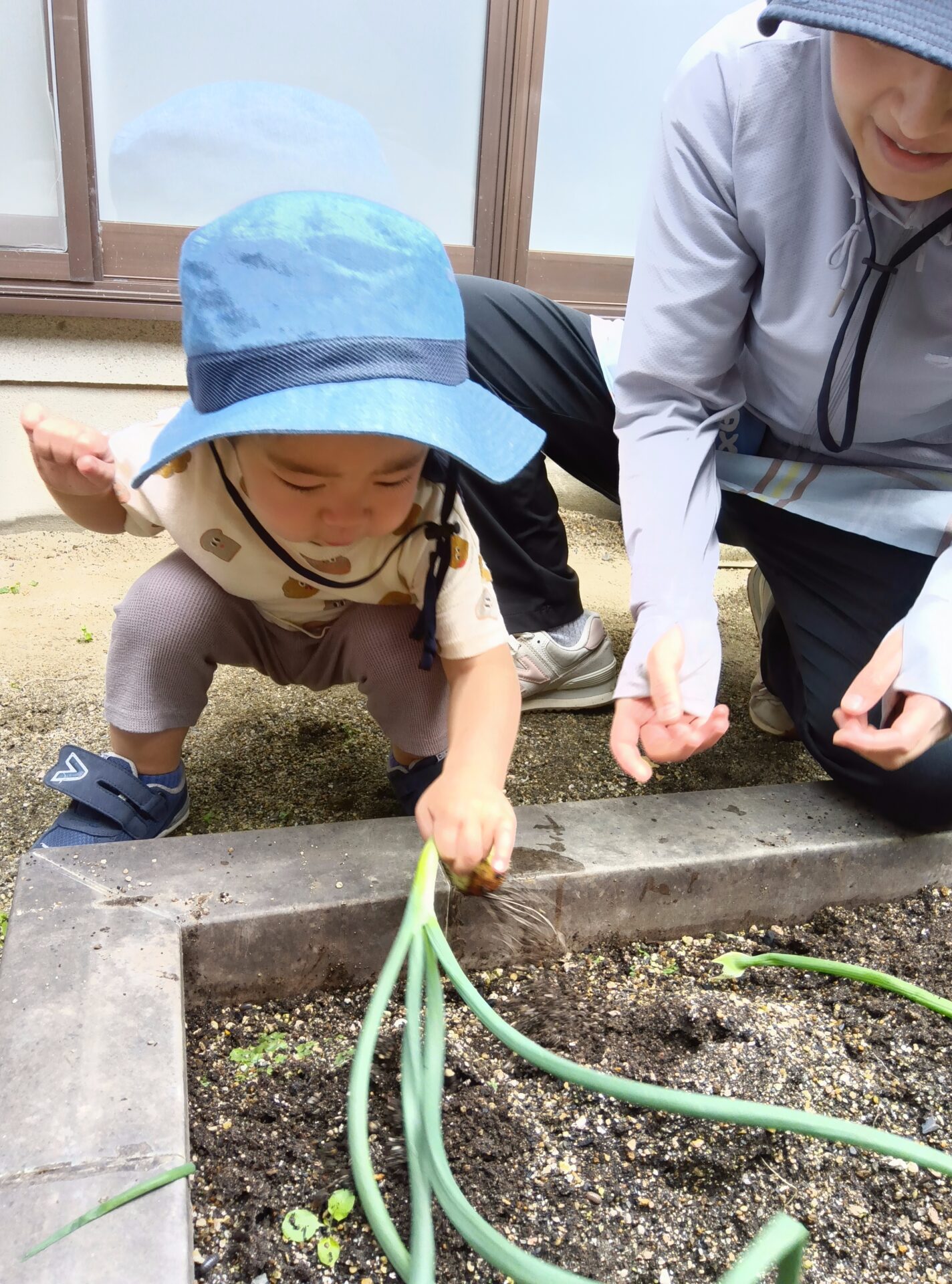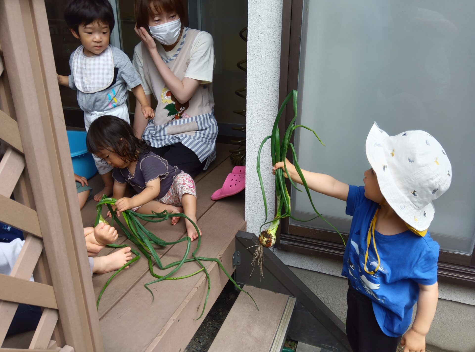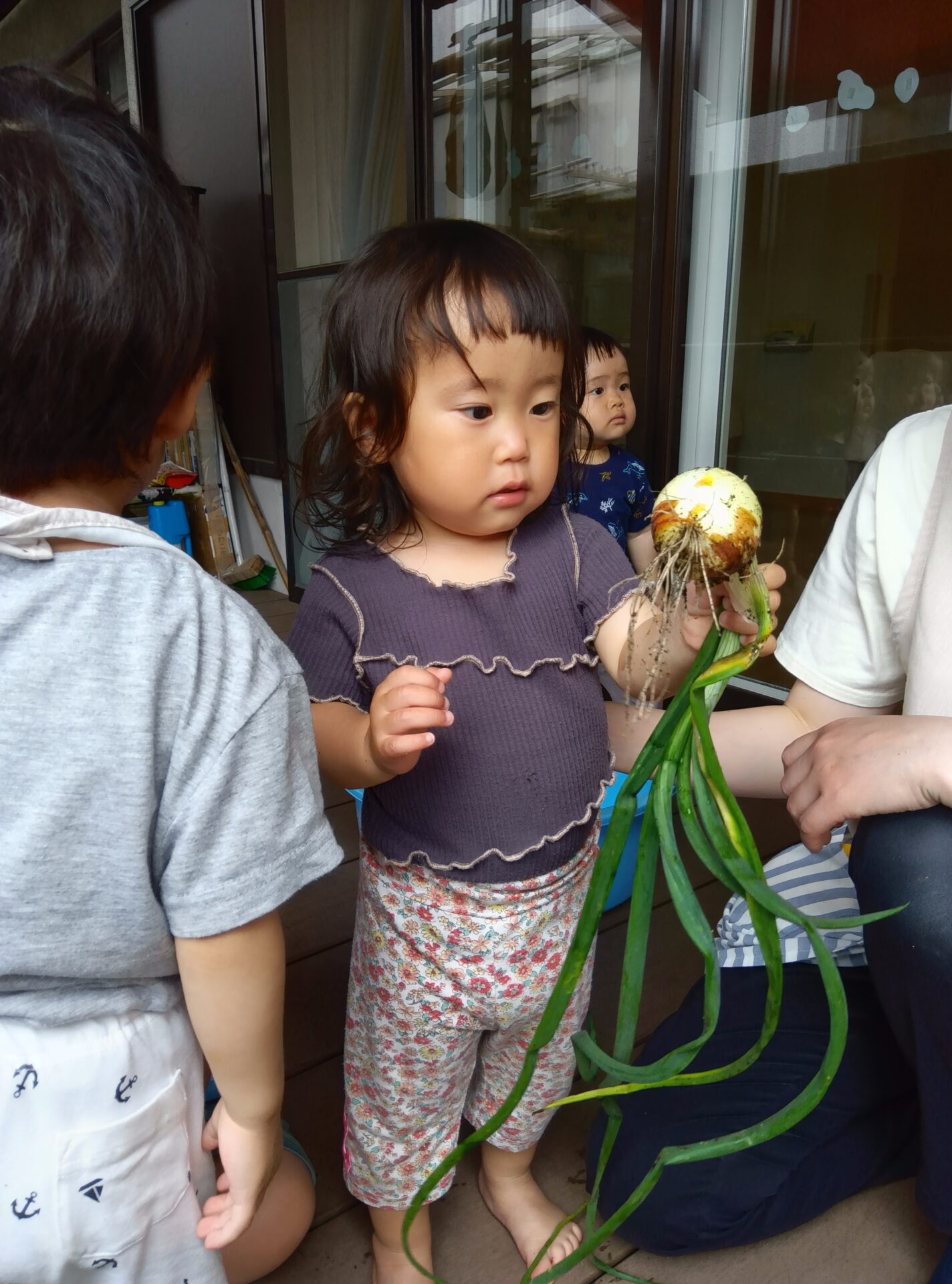 0歳児と1歳児の子どももテラスで収穫できた玉ねぎに興味津々!