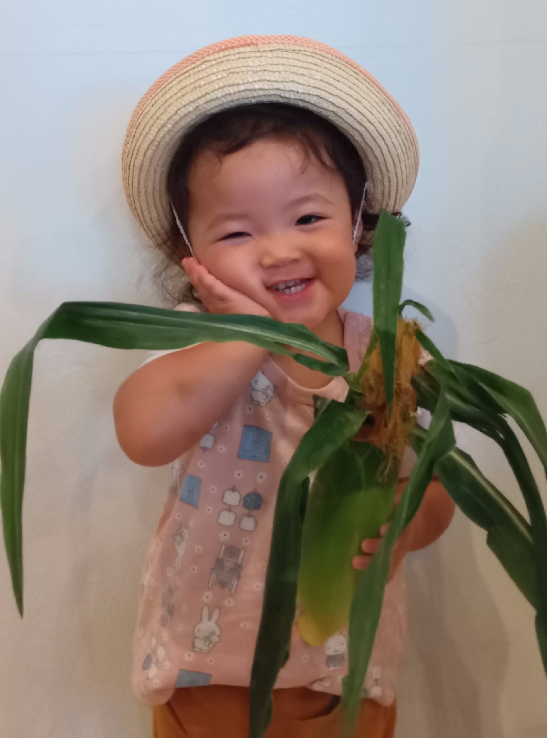 夏らしく、麦わら帽子を被ってとうもろこしと一緒「はい、チーズ!」