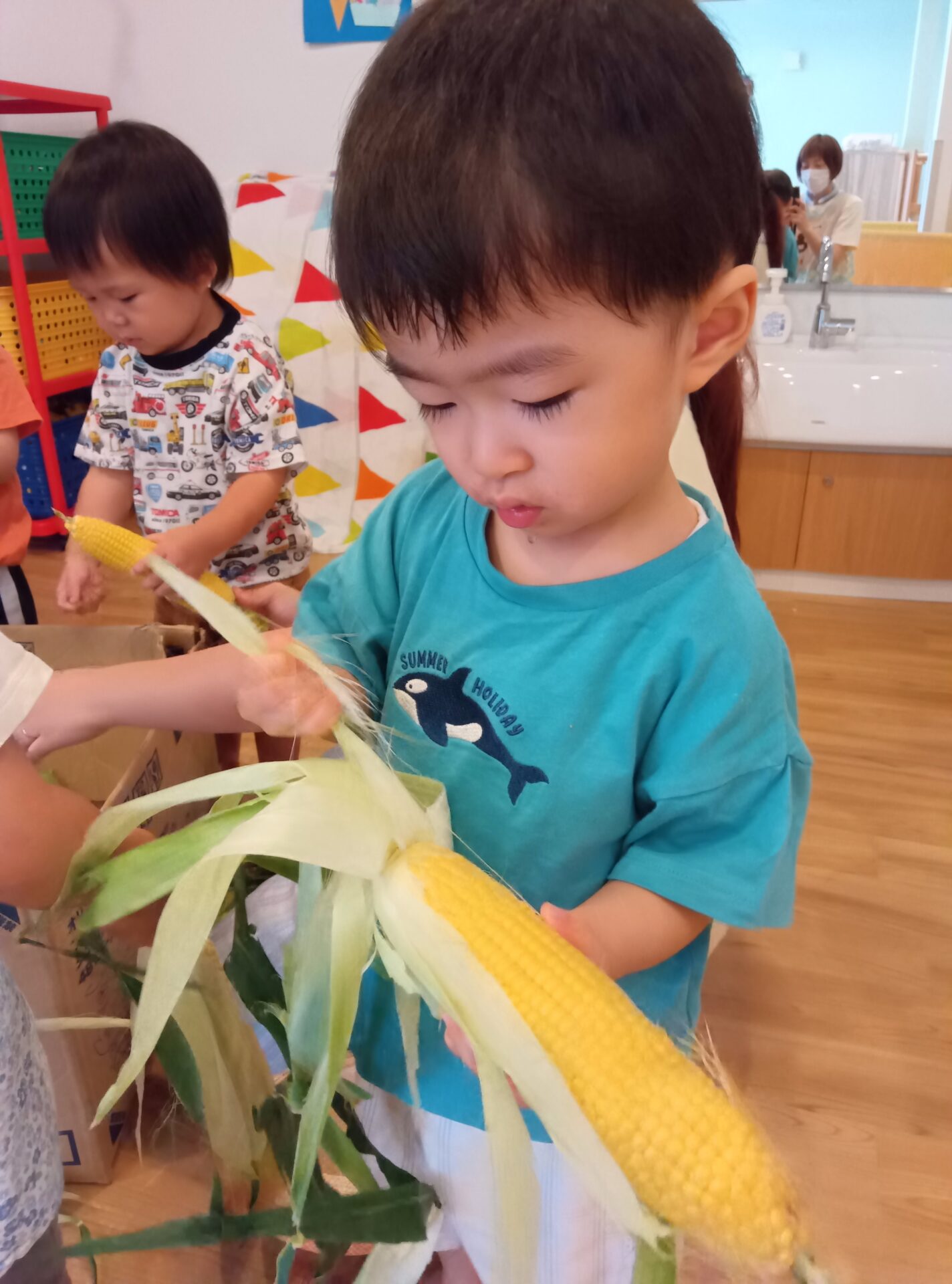 2歳児のみんなでとうもろこしの皮むきをしました。