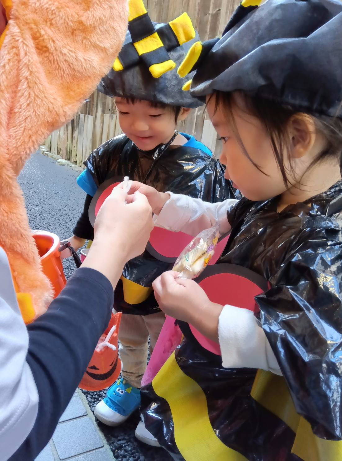 たくさんお菓子をもらって大満足!さぁ、保育園にかえろ~今日の給食はハロウィンメニューです。