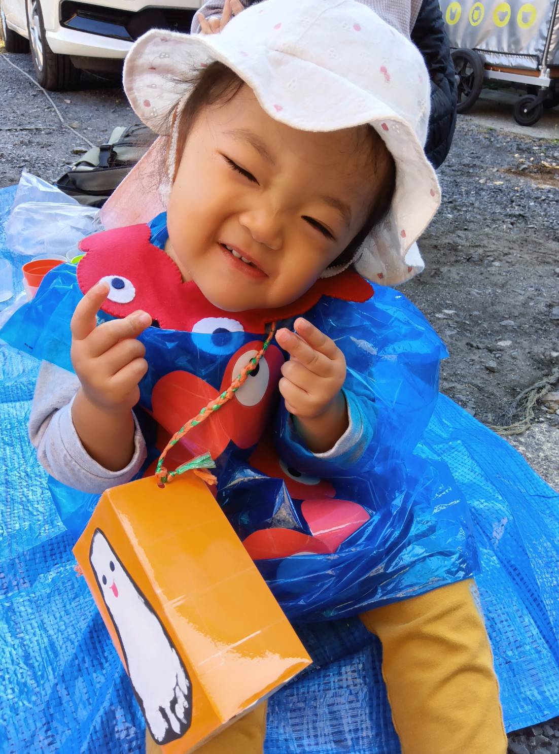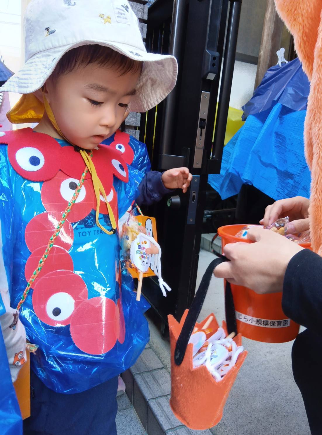 カボチャのオバケがお出迎え。ドキドキしたけどお菓子とプレゼントをもらい、嬉しそうです。