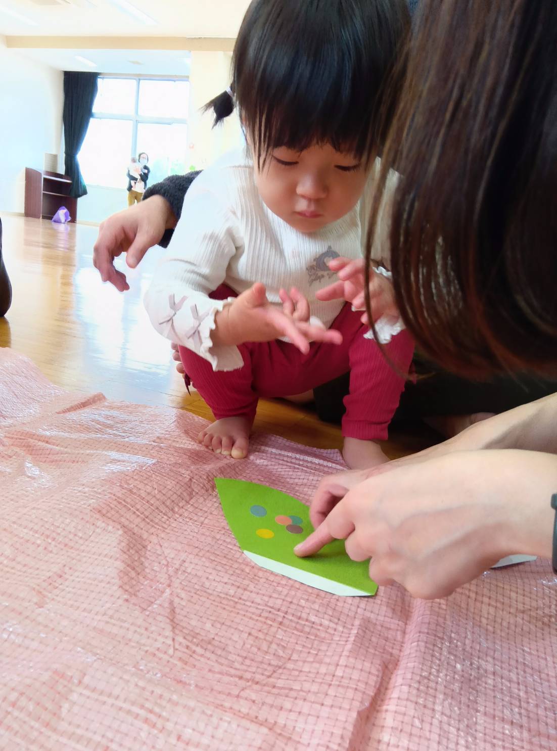 2歳さんは自分でのり付け!0歳さんと1歳さんはシールを貼ったりしましたよ。