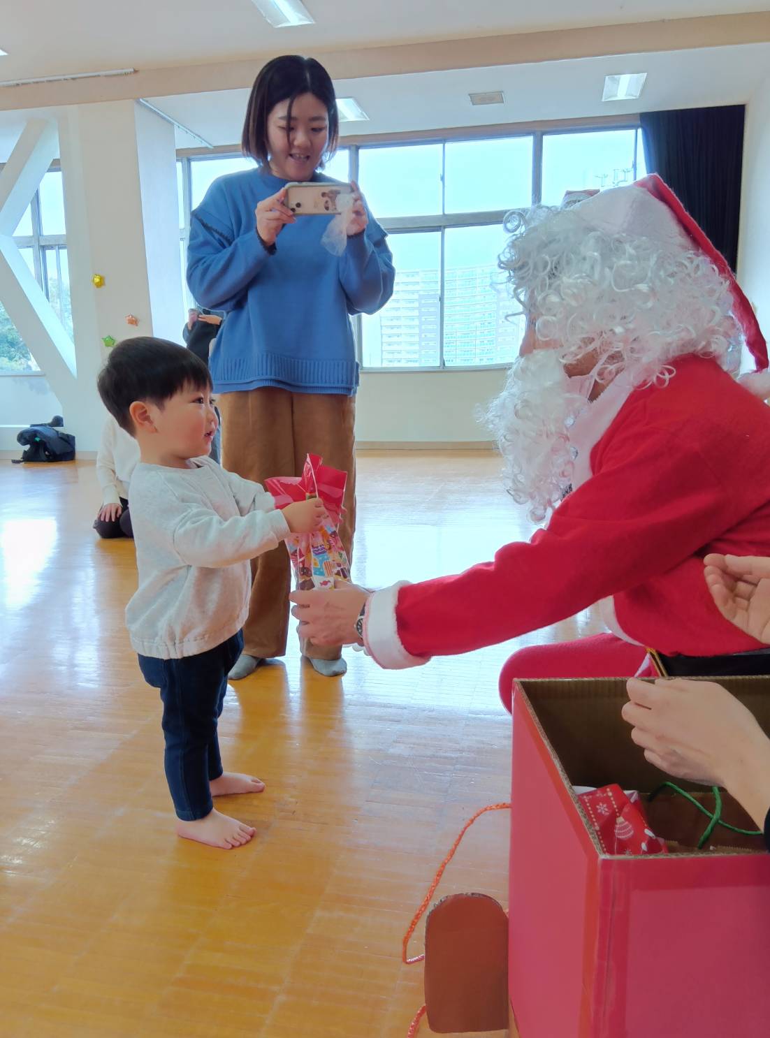 サンタさんにありがとうと手を振ったり、サンタさんから、ジュニアサンタさんへ!かわいいですね。