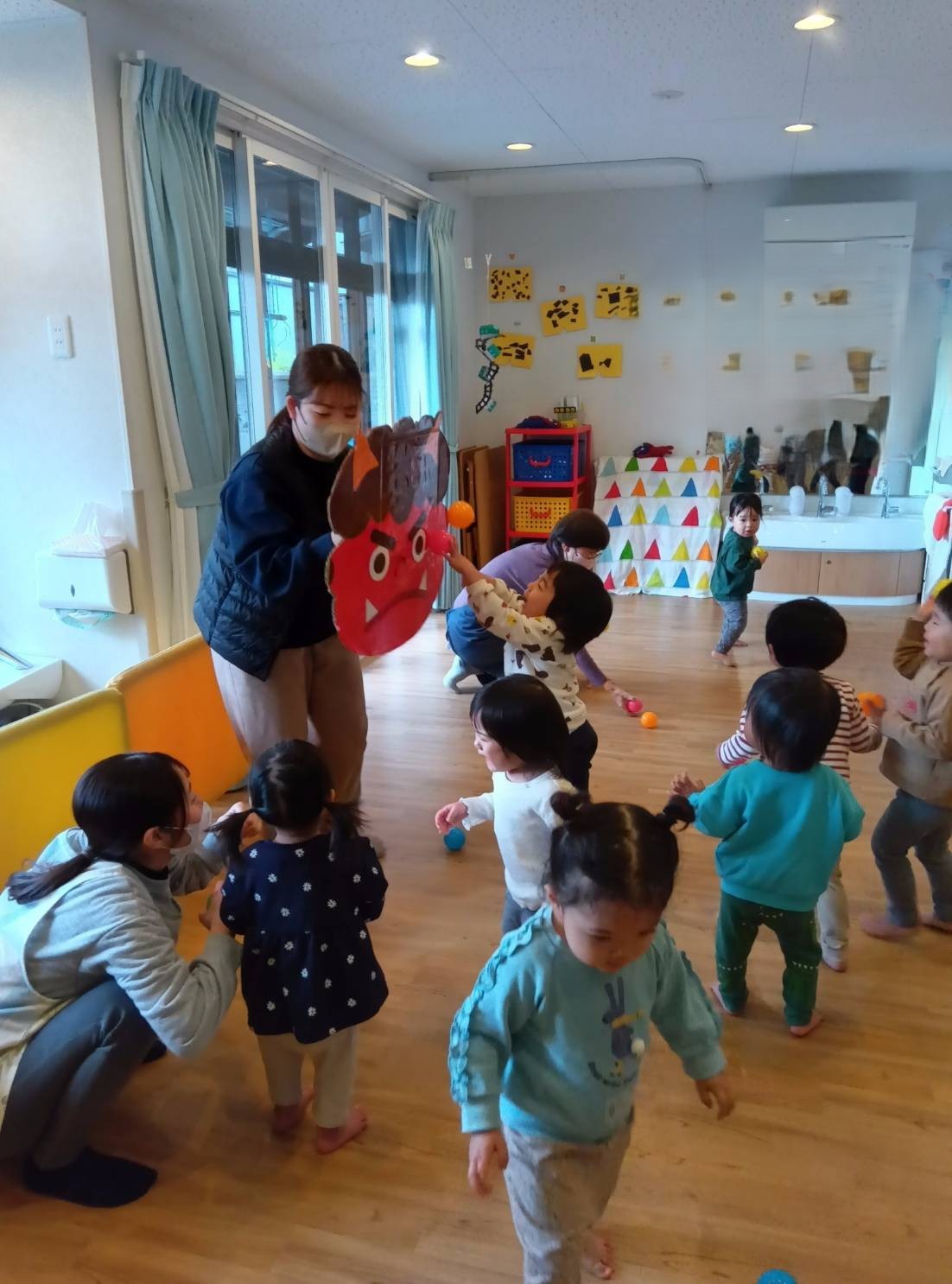 まずは、豆まきのお話を聞いて「鬼はーそと」と言いながら豆ボールを投げようと