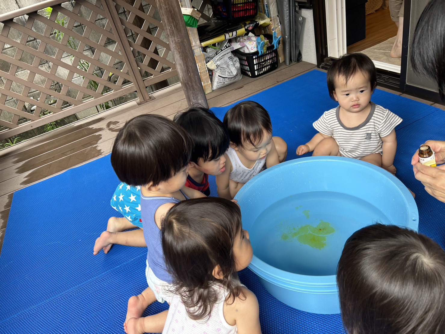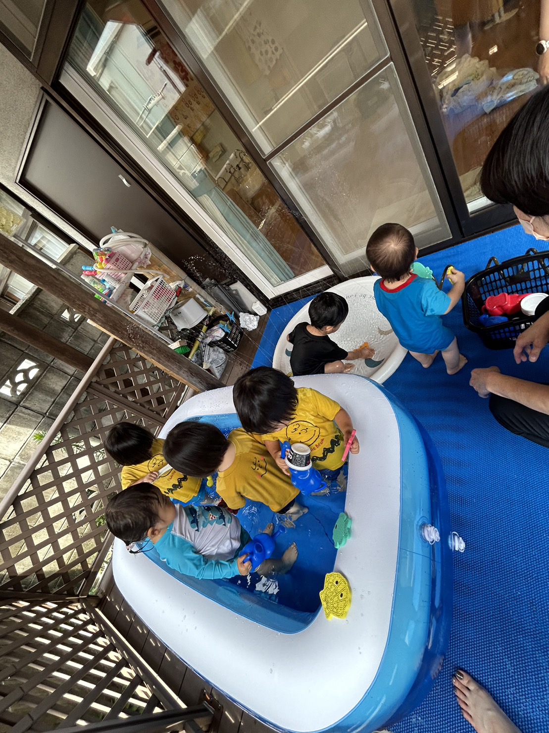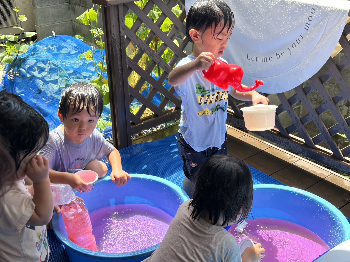 本格的な夏が始まり、石山くじら小規模保育園では毎日テラスで水遊びを楽しんでいます。