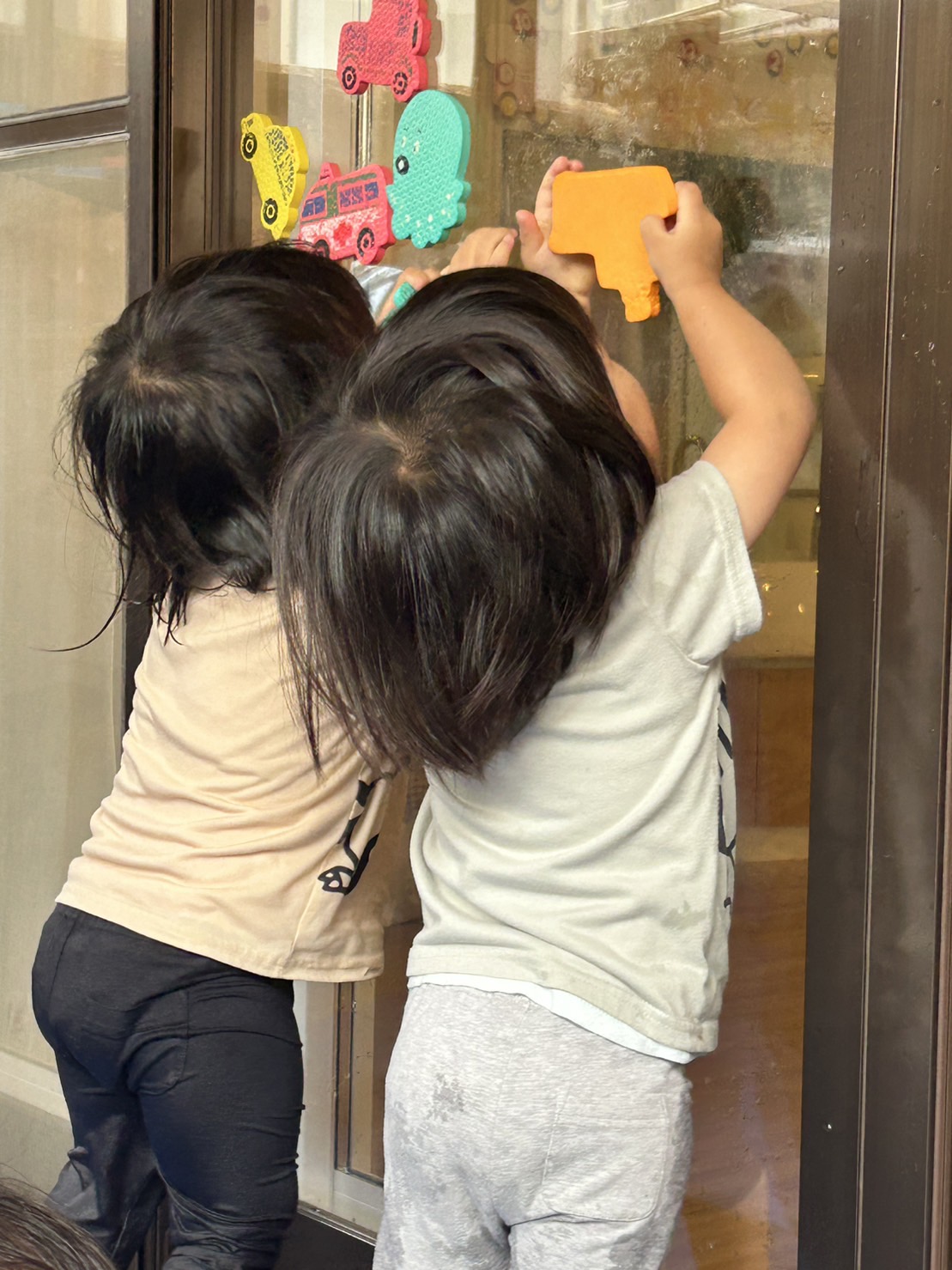 濡らすとガラスに貼りつくおもちゃを使って楽しんだりもしています。
