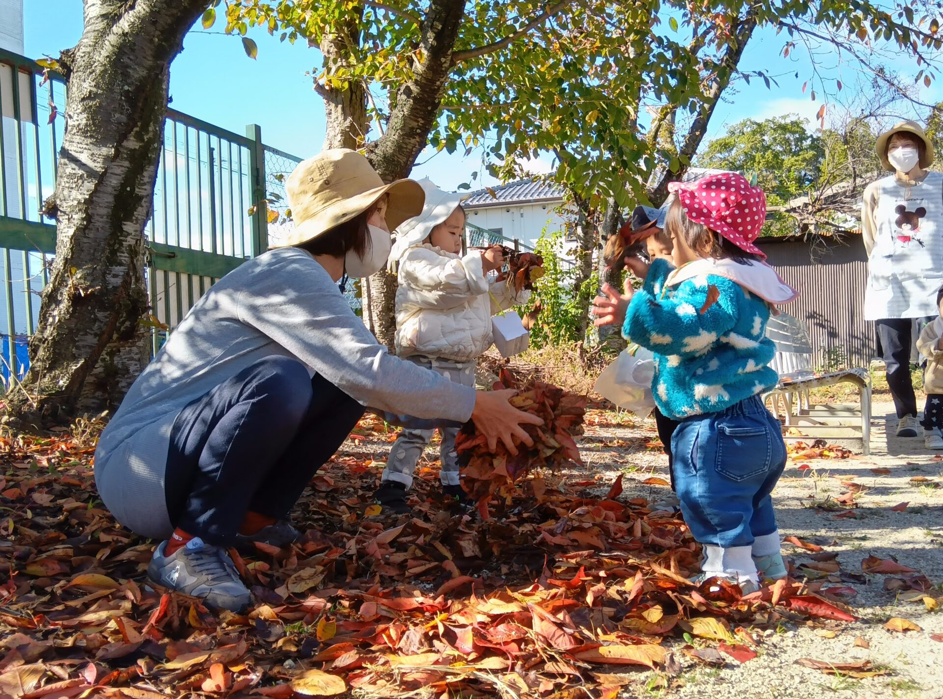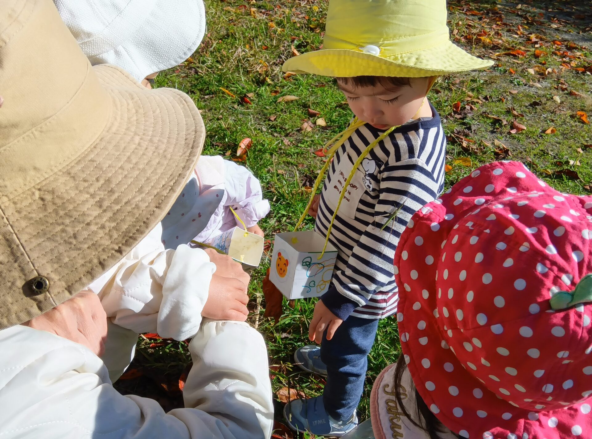 この時期、御霊神社はどんぐりが大豊作です。一心不乱にひらいます。ひらったどんぐりを大事そうに手に握りしめます。なかには小石でカバンが一杯のお友だちもいますが、いっぱい入れてジャーと戻し,また、いっぱいに入れる!その繰り返しが楽しく、こちらもまた一心不乱でした!