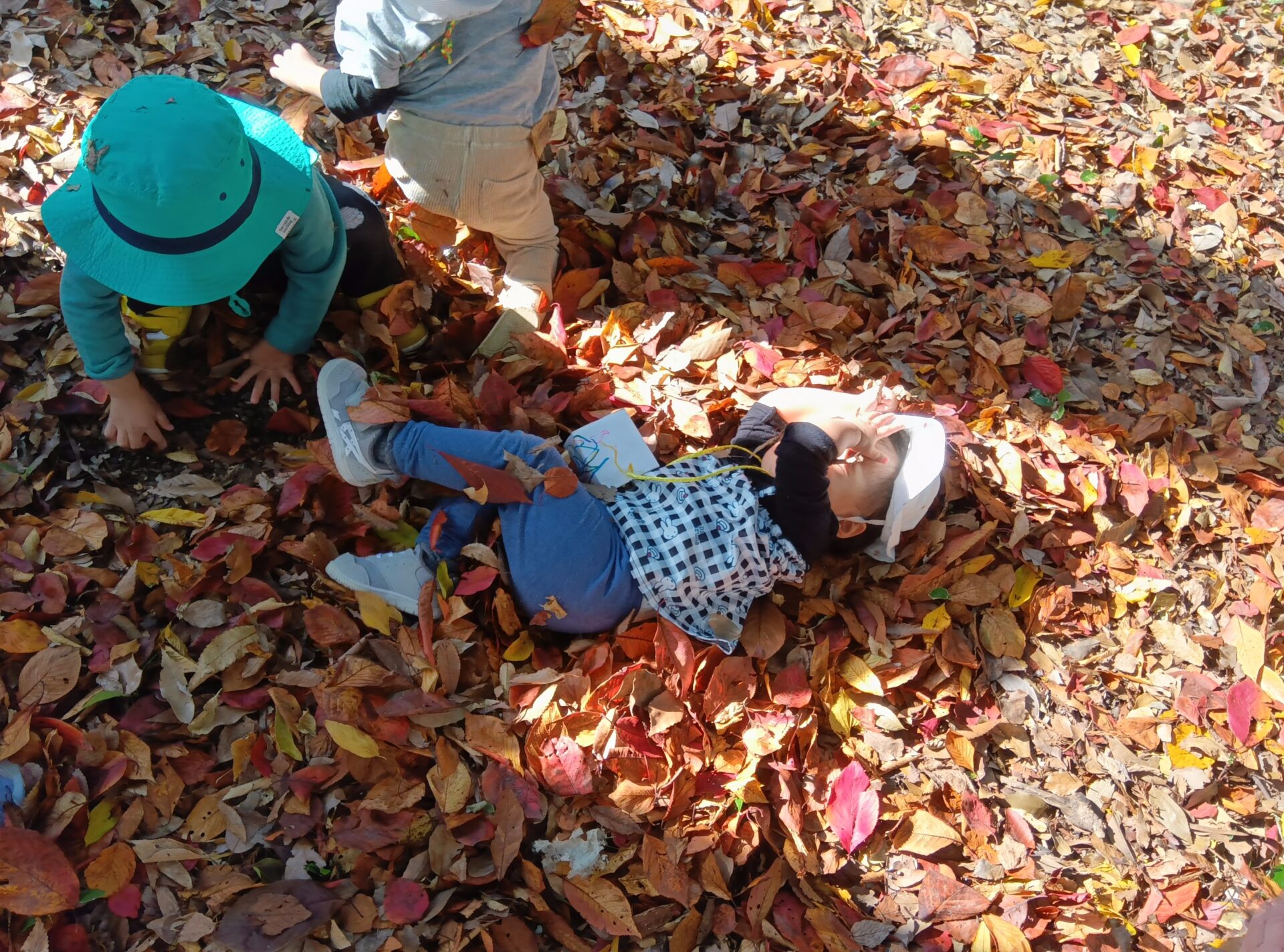 落ち葉のシャワーを浴びたり、ゴロンと寝転がって、全身で感触を楽しんでます。