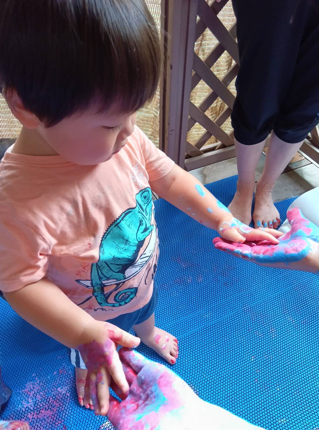 保育者とタッチ!色んな色がついたね。こんな手になっちゃったと見せに来てくれました。