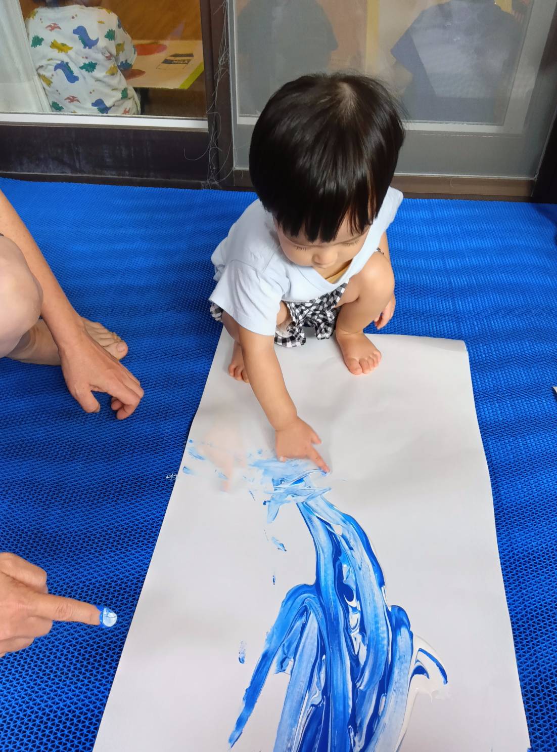 大きな紙にぺたんしよ~ 指や手のひらでぬりぬり、絵の具の感触を楽しみました。