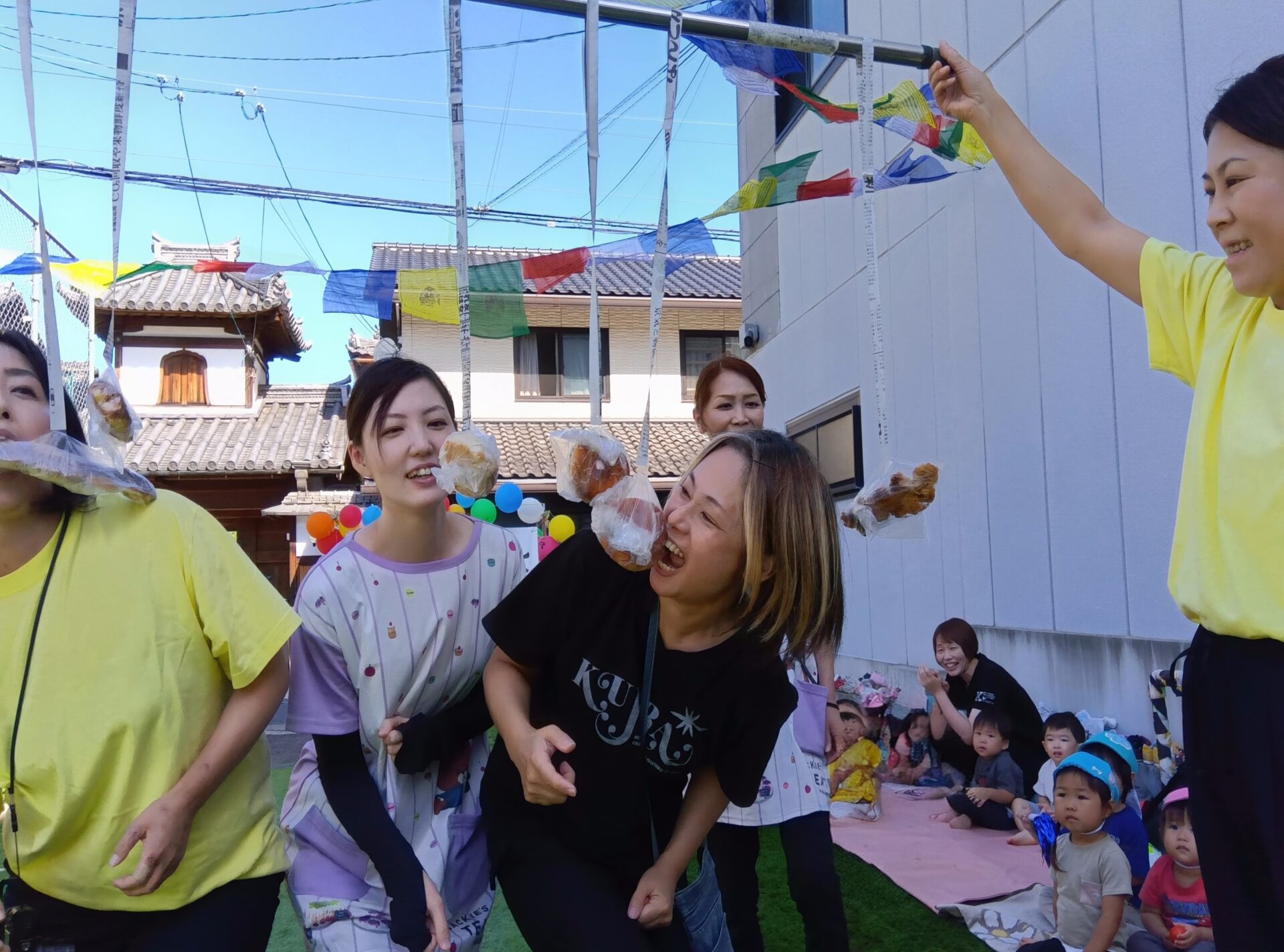 保育者の競技 パン食い競争では子どもたちも「やりたかった~」「また保育園でやろう」と